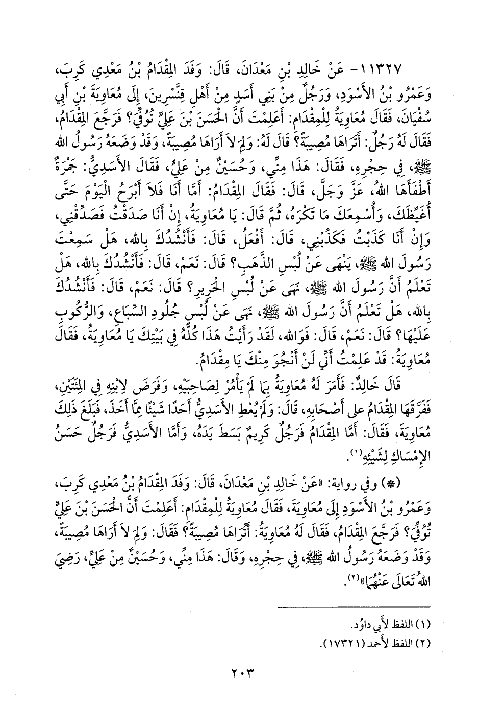 ١١٣٢٧ - عن خالد بن مَعدان، قال: وفد المقدام بن مَعْدي كرب، وعَمرو بن الأسود، ورجل من بني أسد من أهل قنسرين، إلى معاوية بن أبي سفيان، فقال معاوية للمقدام: أعلمت أن الحسن بن علي توفي؟ فرجع المقدام، فقال له رجل: أتراها مصيبة؟ قال له: ولم لا أراها مصيبة، وقد وضعه رسول الله صَلى الله عَليه وسَلم في حجره، فقال: هذا مني، وحسين من علي، فقال الأسدي: جمرة أطفأها الله، عز وجل، قال: فقال المقدام: أما أنا فلا أبرح اليوم حتى أغيظك، وأسمعك ما تكره، ثم قال: يا معاوية، إن أنا صدقت فصدقني، وإن أنا كذبت فكذبني، قال: أفعل، قال: فأنشدك بالله، هل سمعتَ رسول الله صَلى الله عَليه وسَلم ينهى عن لبس الذهب؟ قال: نعم، قال: فأنشدك بالله، هل تعلم أن رسول الله صَلى الله عَليه وسَلم نهى عن لبس الحرير؟ قال: نعم، قال: فأنشدك بالله، هل تعلم أن رسول الله صَلى الله عَليه وسَلم نهى عن لبس جلود السباع، والركوب عليها؟ قال: نعم، قال: فوالله، لقد رأيت هذا كله في بيتك يا معاوية، فقال معاوية: قد علمت أني لن أنجو منك يا مقدام.