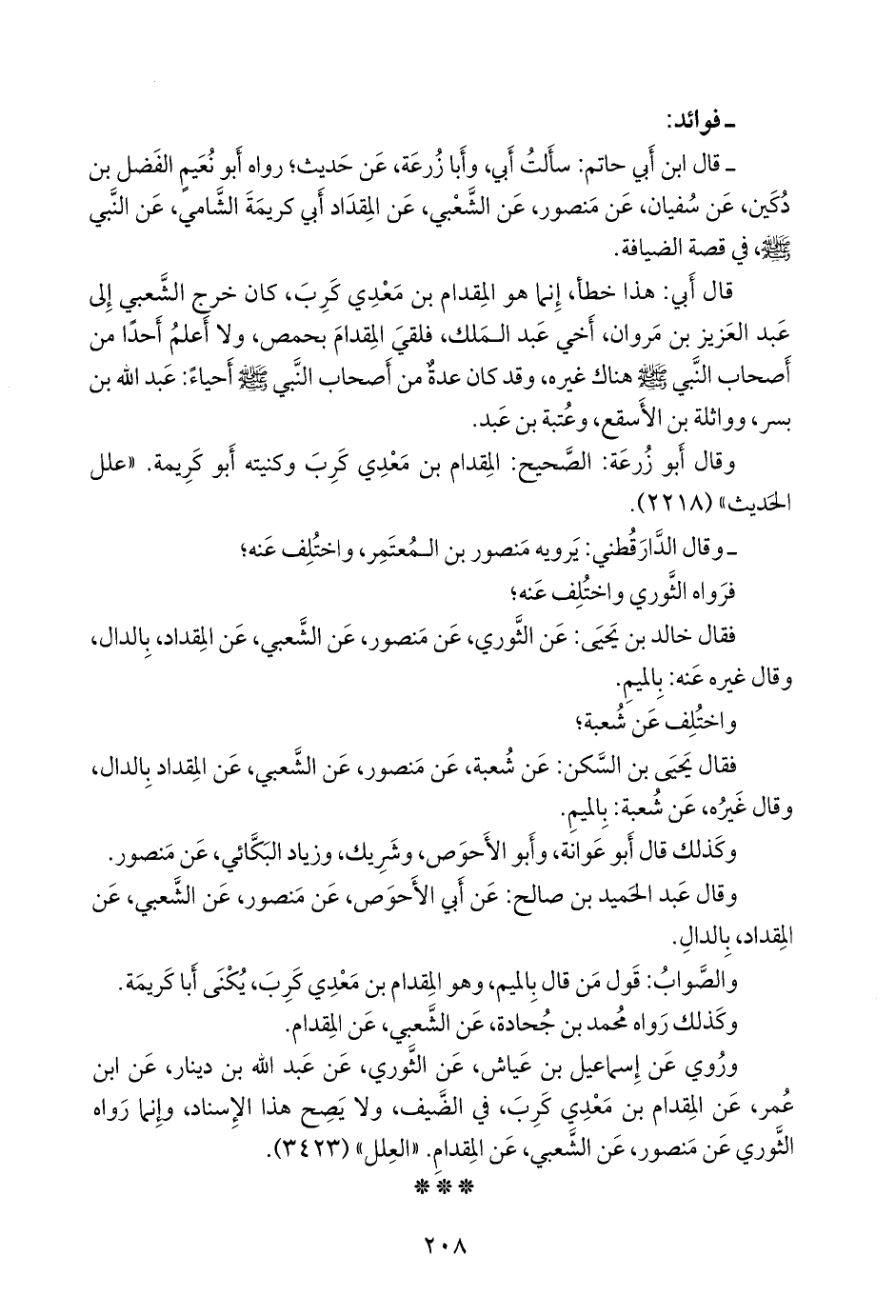 - قال عبد الرَّحمَن بن أبي حاتم الرازي: سألت أبي، وأَبا زُرعَة، عن حديث؛ رواه أَبو نُعيم الفضل بن دُكَين، عن سفيان، عن منصور، عن الشعبي، عن المقداد أبي كريمة الشامي، عن النبي صَلى الله عَليه وسَلم في قصة الضيافة.