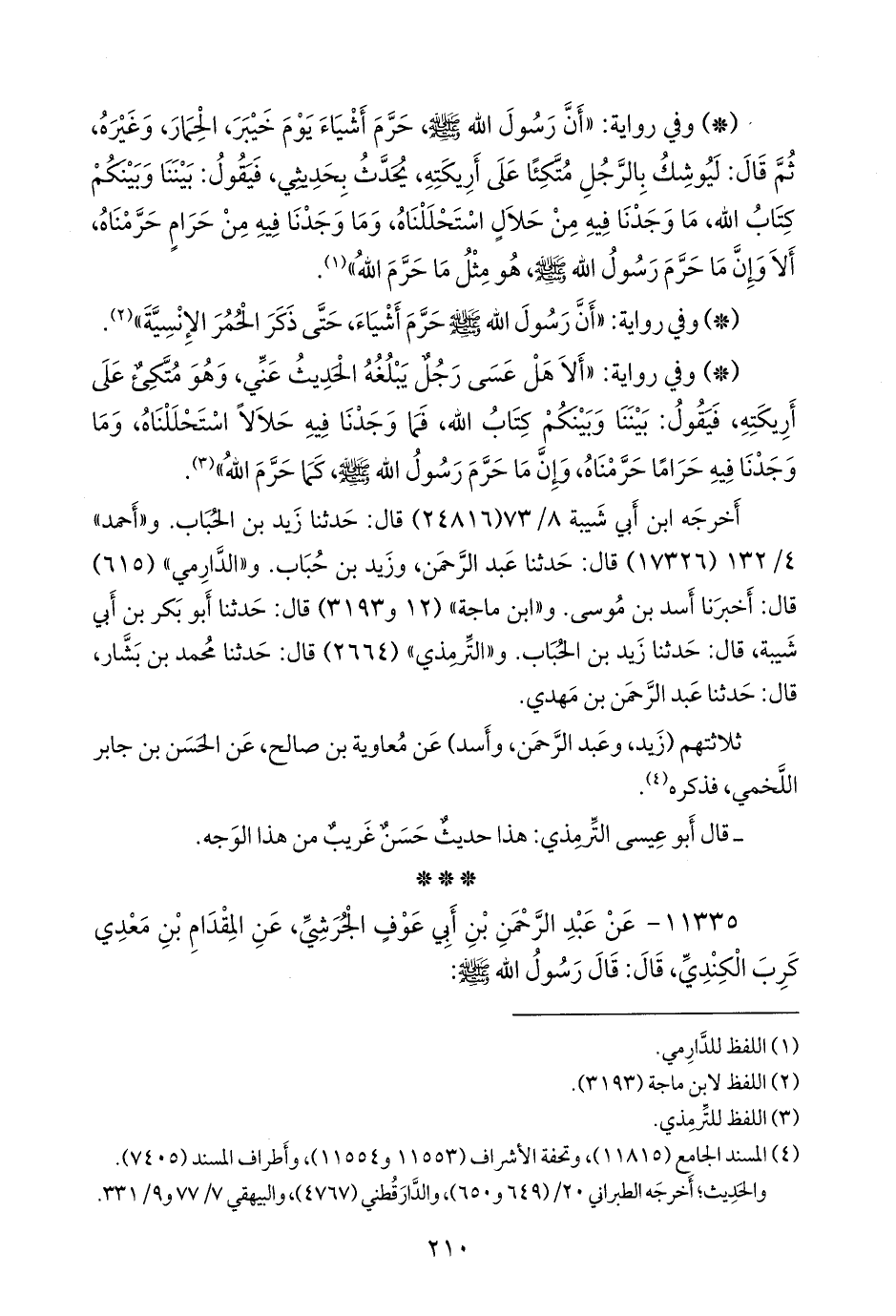 - وفي رواية: «ألا هل عسى رجل يبلغه الحديث عني، وهو متكئ على أريكته، فيقول: بيننا وبينكم كتاب الله، فما وجدنا فيه حلالا استحللناه، وما وجدنا فيه حراما حرمناه، وإن ما حرم رسول الله صَلى الله عَليه وسَلم كما حرم الله» (¬١).