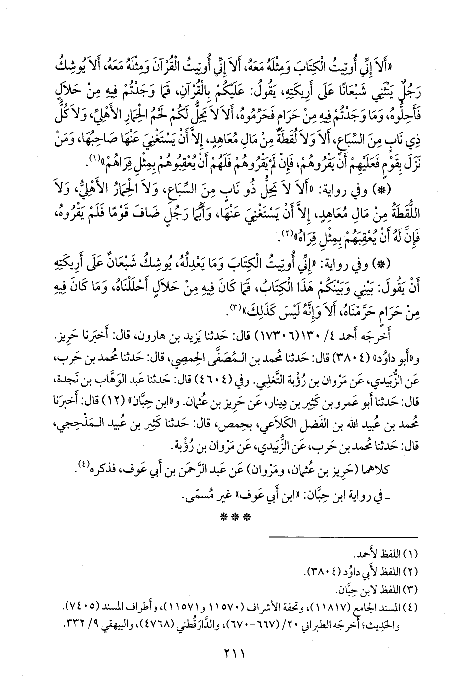 - وفي رواية: «إني أوتيت الكتاب وما يعدله، يوشك شبعان على أريكته أن يقول: بيني وبينكم هذا الكتاب، فما كان فيه من حلال أحللناه، وما كان فيه من حرام حرمناه، ألا وإنه ليس كذلك» (¬١).