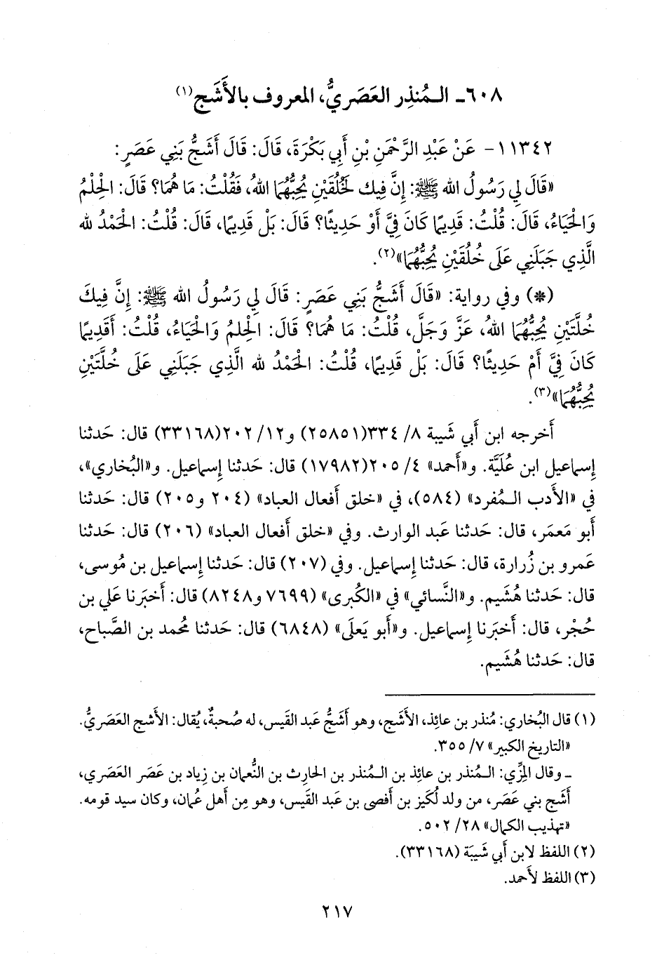 - وفي رواية: «قال أشج بني عصر: قال لي رسول الله صَلى الله عَليه وسَلم: إن فيك خلتين يحبهما الله، عز وجل، قلت: ما هما؟ قال: الحلم والحياء، قلت: أقديما كان في أم حديثا؟ قال: بل قديما، قلت: الحمد لله الذي جبلني على خلتين يحبهما» (¬٣).