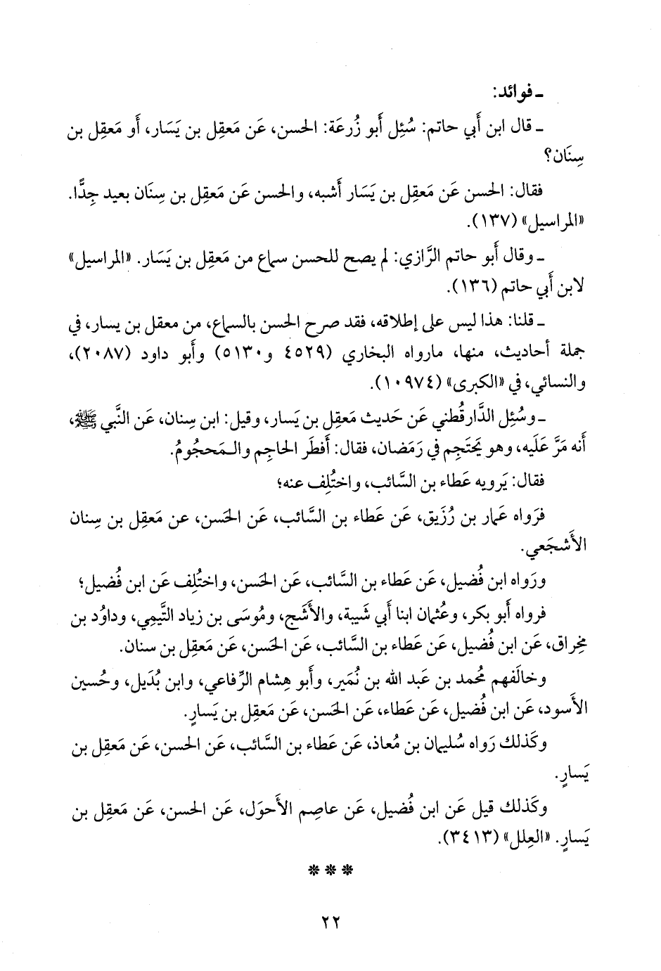 - وقال أَبو حاتم الرازي: لم يصح للحسن سماع من معقل بن يسار. «المراسيل» لابن أبي حاتم (١٣٦).