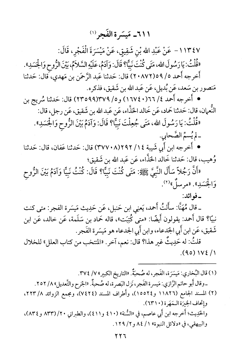 - قلنا: إِسناده ضعيفٌ؛ قال مهنا: سألت أحمد، يعني ابن حنبل، عن حديث ميسرة الفجر: متى كنت نبيا؟ قال أحمد: يقولون أيضا: «متى كتبت»، قاله حماد بن سلمة، عن خالد، عن ابن شقيق، عن ابن أبي الجدعاء، وابن أبي الجدعاء هو ميسرة الفجر.