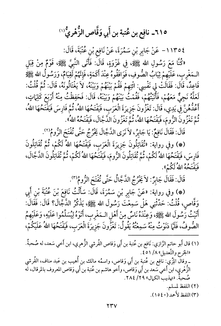 - وفي رواية: «عن جابر بن سَمُرَة، قال: سألت نافع بن عُتبة بن أبي وقاص، قلت: حدثني هل سمعتَ رسول الله صَلى الله عَليه وسَلم يذكر الدجال؟ قال: فقال: أتيت رسول الله صَلى الله عَليه وسَلم وعنده ناس من أهل المغرب، أتوه ليسلموا عليه، وعليهم الصوف، فلما دنوت منه سمعته يقول: تغزون جزيرة العرب، فيفتحها الله عليكم،