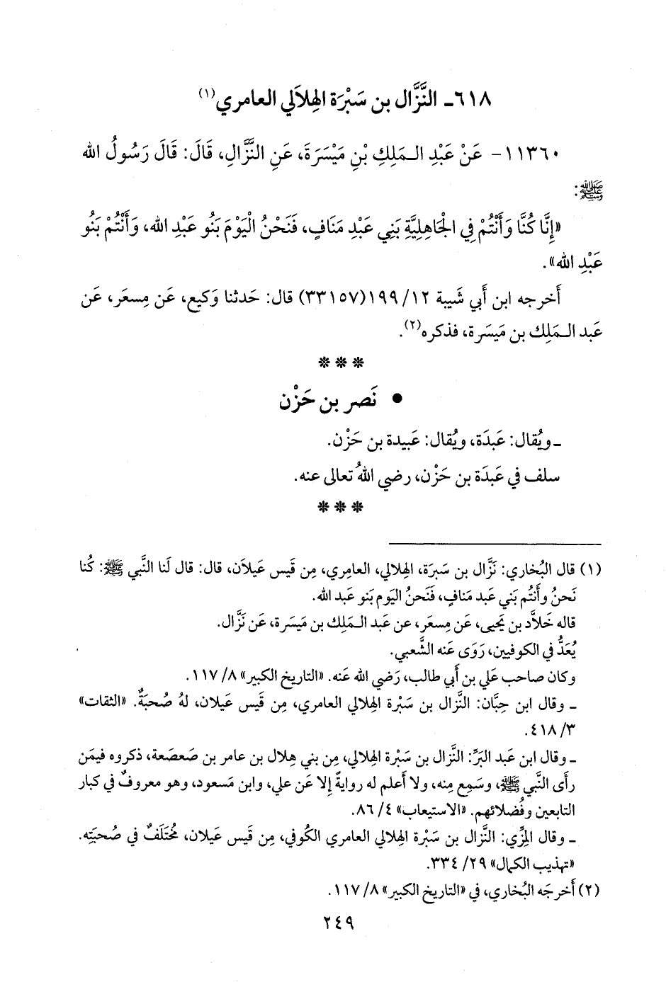(¬١) قال البخاري: نزال بن سبرة، الهلالي، العامري، من قيس عيلان، قال: قال لنا النبي صَلى الله عَليه وسَلم: كنا نحن وأنتم بني عبد مناف، فنحن اليوم بنو عبد الله.