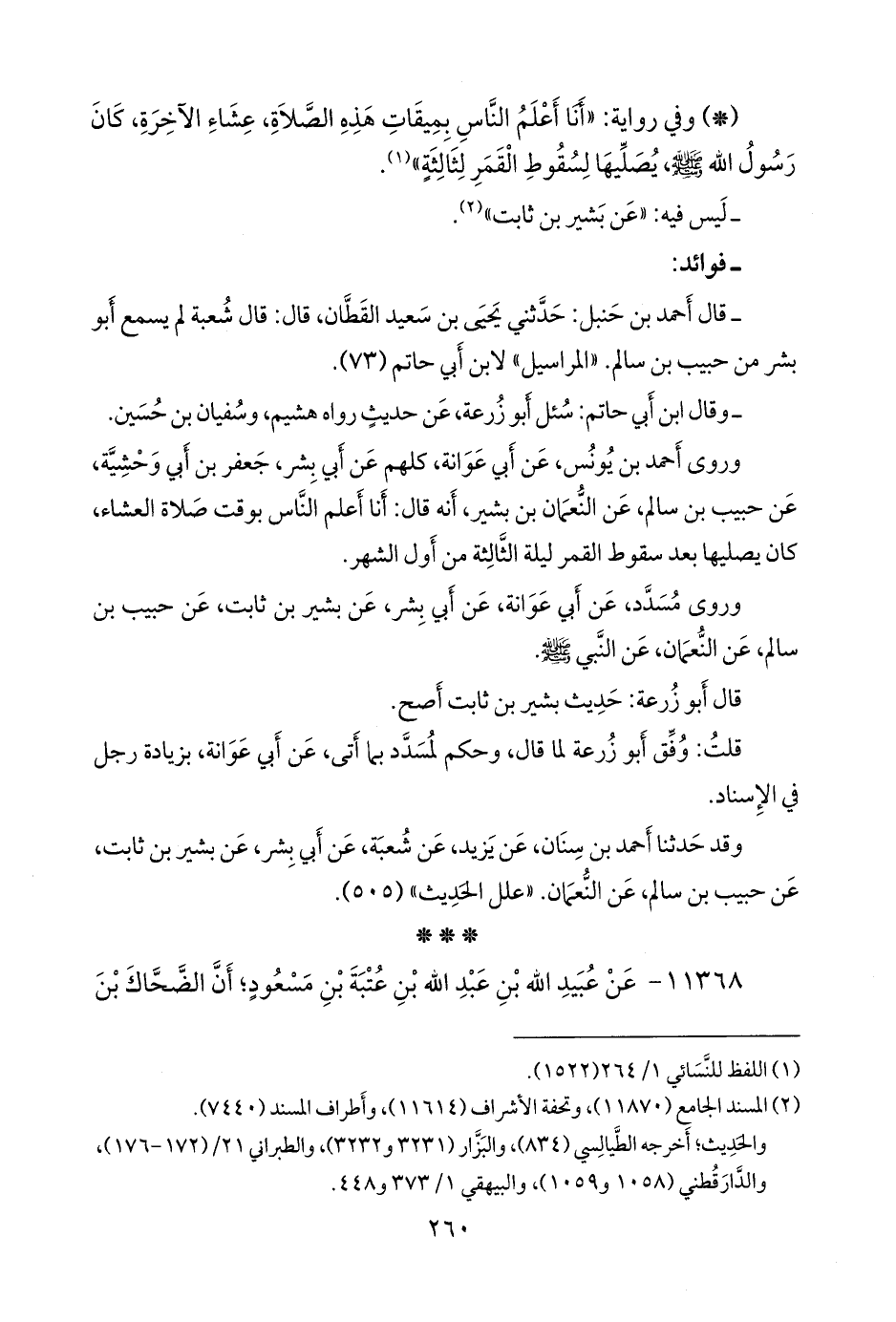 وروى أحمد بن يونس، عن أبي عَوانة، كلهم عن أبي بشر جعفر بن أبي وحشية، عن حبيب بن سالم، عن النعمان بن بشير، أنه قال: أنا أعلم الناس بوقت صلاة العشاء، كان يصليها بعد سقوط القمر ليلة الثالثة من أول الشهر.
