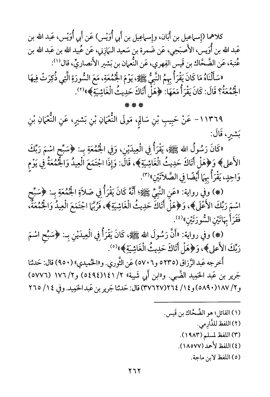 - وفي رواية: «أن رسول الله صَلى الله عَليه وسَلم كان يقرأ في العيدين بـ: {سَبِّحِ اسْمَ رَبِّكَ الأَعْلَى}، و {هل أتاك حديث الغاشية}» (¬٣).