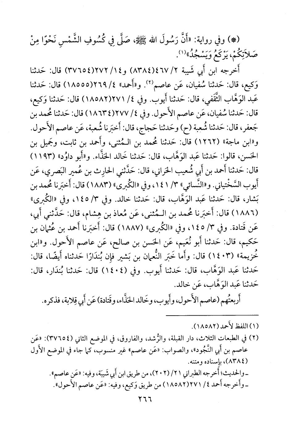 أخرجه ابن أبي شيبة (٨٣٨٤ و ٣٧٦٥٤) قال: حدثنا وكيع، قال: حدثنا سفيان، عن عاصم (¬١). و «أحمد» (١٨٥٥٥) قال: حدثنا عبد الوَهَّاب الثقفي، قال: حدثنا أيوب. وفي (١٨٥٨٢) قال: حدثنا وكيع، قال: حدثنا سفيان، عن عاصم الأحول. وفي (١٨٦٣٤) قال: حدثنا محمد بن جعفر، قال: حدثنا شعبة (ح) وحدثنا حجاج، قال: أخبرنا شعبة، عن عاصم الأحول. و «ابن ماجة» (١٢٦٢) قال: حدثنا محمد بن المثنى، وأحمد بن ثابت، وجميل بن الحسن، قالوا: حدثنا عبد الوَهَّاب، قال: حدثنا خالد الحَذَّاء. و «أَبو داود» (١١٩٣) قال: حدثنا أحمد بن أبي شعيب الحراني، قال: حدثني الحارث بن عمير البصري، عن أيوب السَّخْتِياني. و «النَّسَائي» ٣/ ١٤١، وفي «الكبرى» (١٨٨٣) قال: أخبرنا محمد بن بشار، قال: حدثنا عبد الوَهَّاب، قال: حدثنا خالد. وفي ٣/ ١٤٥، وفي «الكبرى» (١٨٨٦) قال: أخبرنا محمد بن المثنى، عن معاذ بن هشام، قال: حدثني أبي، عن قتادة. وفي ٣/ ١٤٥، وفي «الكبرى» (١٨٨٧) قال: أخبرنا أحمد بن عثمان بن حكيم، قال: حدثنا أَبو نُعيم، عن الحسن بن صالح، عن عاصم الأحول.