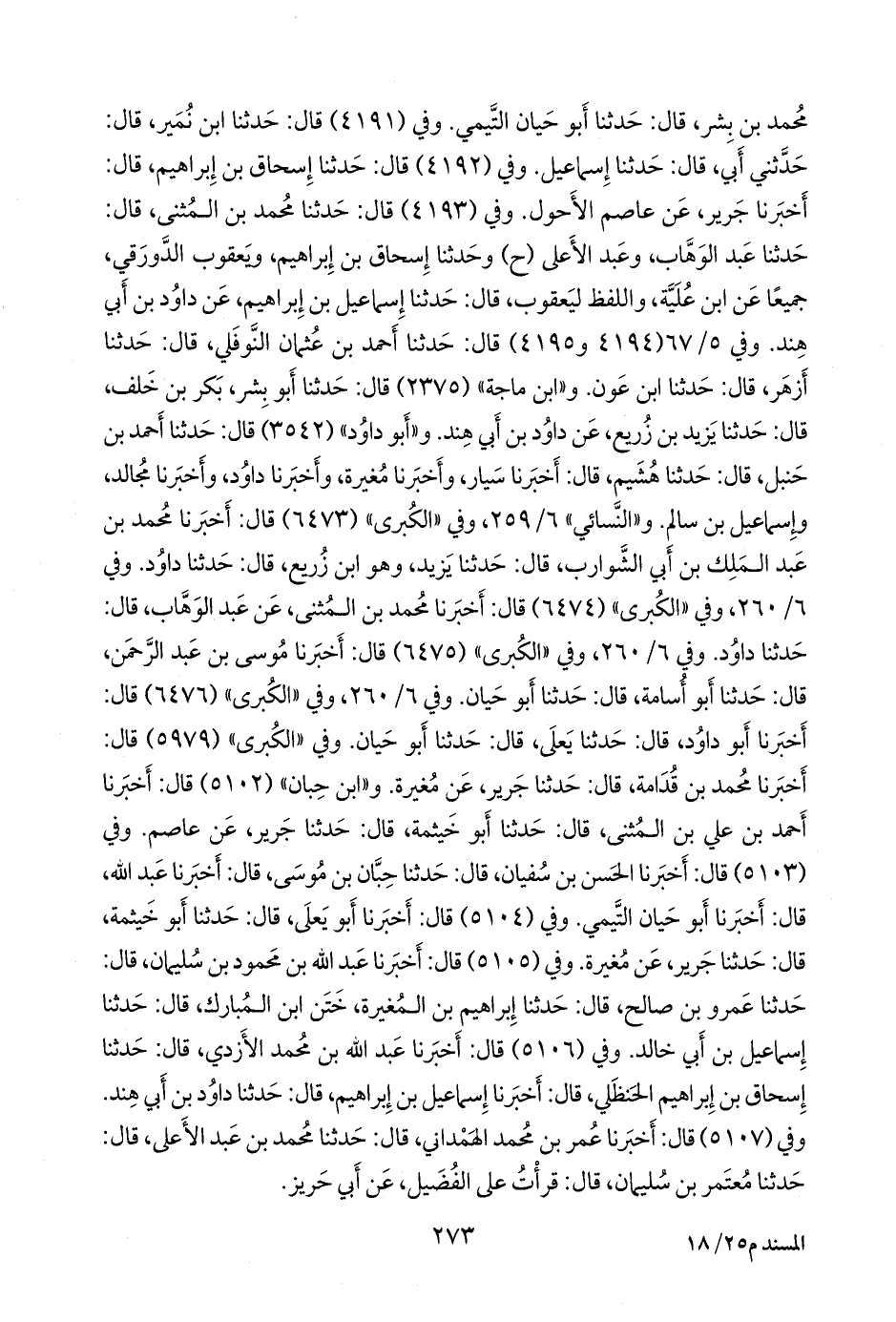 وفي (٥١٠٤) قال: أخبرنا أَبو يَعلى، قال: حدثنا أَبو خيثمة، قال: حدثنا جرير، عن مغيرة. وفي (٥١٠٥) قال: أخبرنا عبد الله بن محمود بن سليمان، قال: حدثنا عَمرو بن صالح، قال: حدثنا إبراهيم بن المغيرة، ختن ابن المبارك، قال: حدثنا إسماعيل بن أبي خالد. وفي (٥١٠٦) قال: أخبرنا عبد الله بن محمد الأزدي، قال: حدثنا إسحاق بن إبراهيم الحنظلي، قال: أخبرنا إسماعيل بن إبراهيم، قال: حدثنا داود بن أبي هند. وفي (٥١٠٧) قال: أخبرنا عمر بن محمد الهمداني، قال: حدثنا محمد بن عبد الأعلى، قال: حدثنا مُعتَمِر بن سليمان، قال: قرأت على الفضيل، عن أبي حريز.