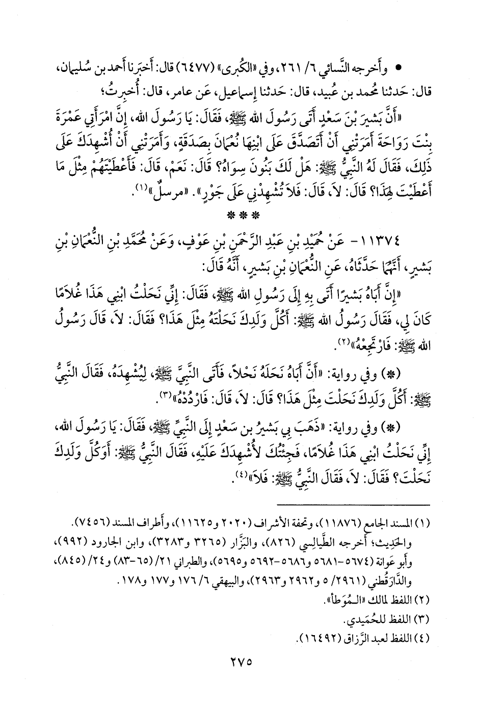 - وفي رواية: «ذهب بي بشير بن سعد إلى النبي صَلى الله عَليه وسَلم فقال: يا رسول الله، إني نحلت ابني هذا غلاما، فجئتك لأشهدك عليه، فقال النبي صَلى الله عَليه وسَلم: أوكل ولدك نحلت؟ فقال: لا، فقال النبي صَلى الله عَليه وسَلم: فلا» (¬٣).