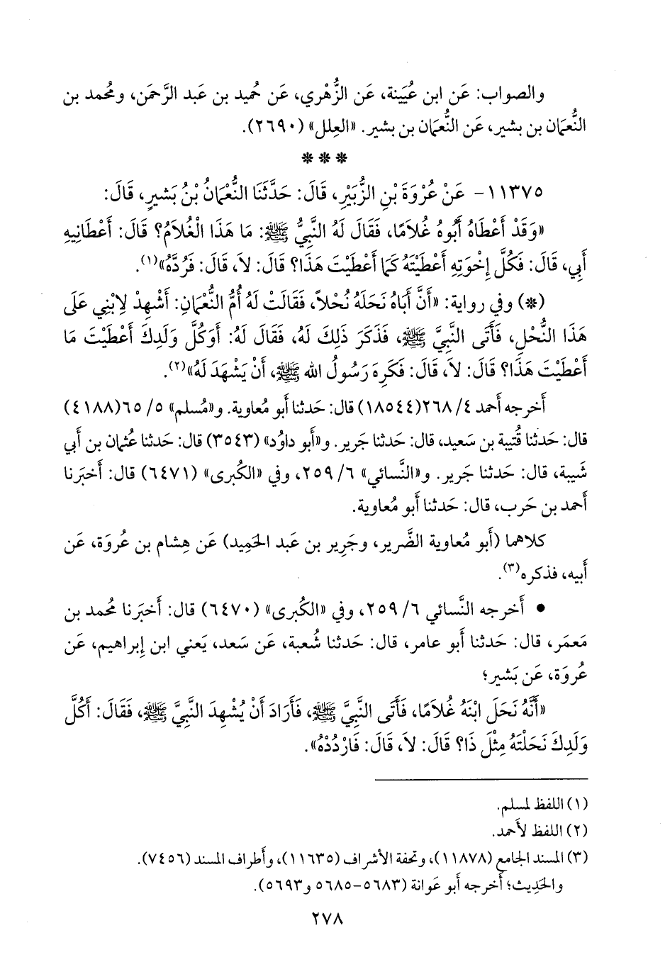 «أن بشيرا أتى النبي صَلى الله عَليه وسَلم فقال: يا نبي الله، نحلت النعمان نحلة، قال: أعطيت لإخوته؟ قال: لا، قال: فاردده». «مُرسَل».