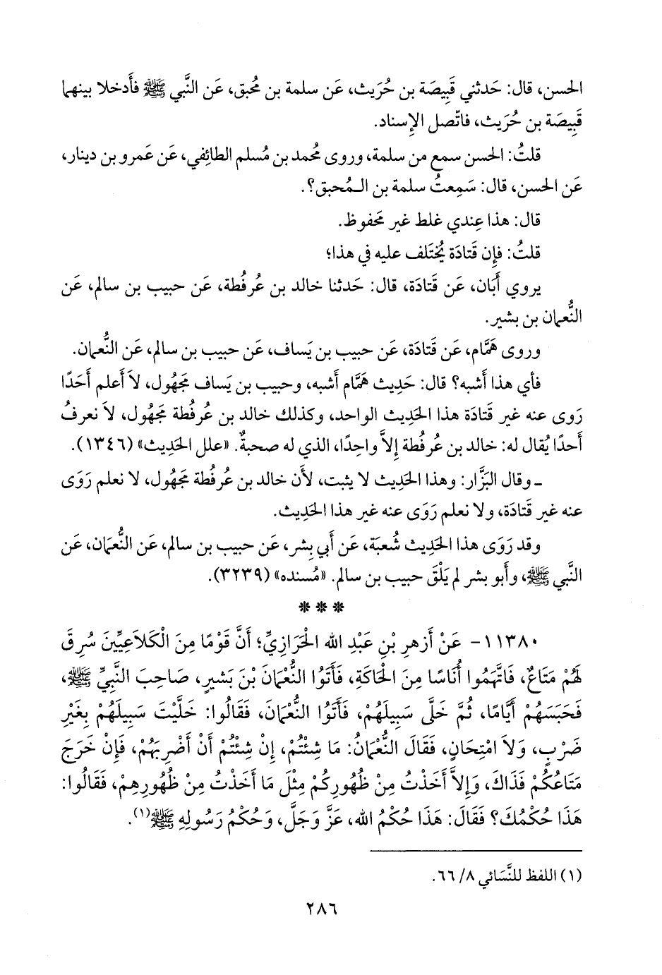 ١١٣٨٠ - عن أزهر بن عبد الله الحرازي؛ أن قوما من الكَلاعيين سرق لهم متاع، فاتهموا أناسا من الحاكة، فأتوا النعمان بن بشير، صاحب النبي صَلى الله عَليه وسَلم فحبسهم أياما، ثم خلى سبيلهم، فأتوا النعمان، فقالوا: خليت سبيلهم بغير ضرب، ولا امتحان، فقال النعمان: ما شئتم، إن شئتم أن أضربهم، فإن خرج متاعكم فذاك، وإلا أخذت من ظهوركم مثل ما أخذت من ظهورهم، فقالوا: هذا حكمك؟ فقال: هذا حكم الله، عز وجل، وحكم رسوله صَلى الله عَليه وسَلم (¬١).