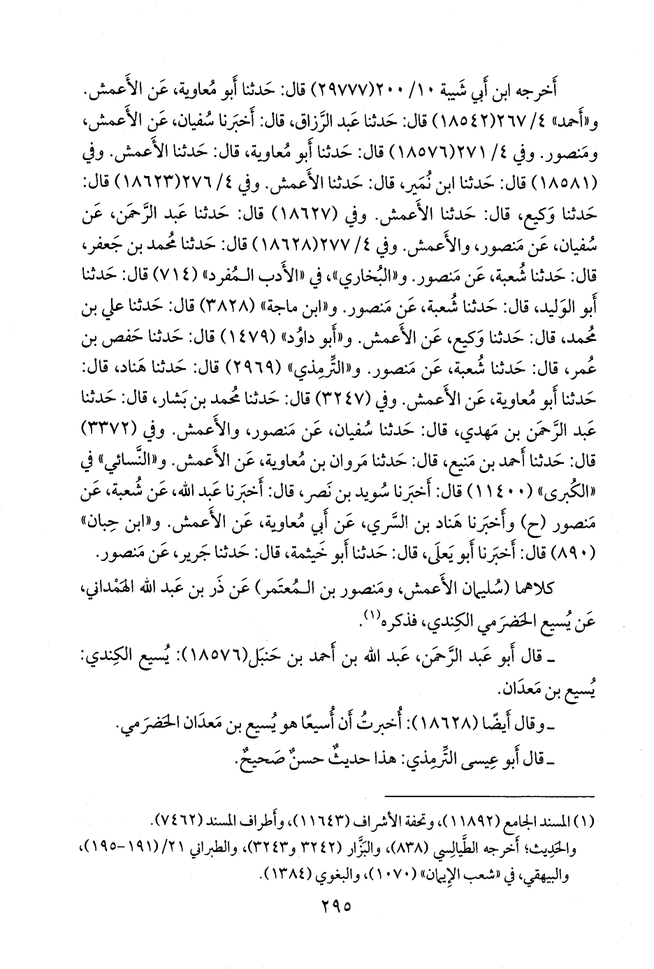وفي (٣٢٤٧) قال: حدثنا محمد بن بشار، قال: حدثنا عبد الرَّحمَن بن مهدي، قال: حدثنا سفيان، عن منصور، والأعمش. وفي (٣٣٧٢) قال: حدثنا أحمد بن مَنيع، قال: حدثنا مروان بن معاوية، عن الأعمش. و «النَّسَائي» في «الكبرى» (١١٤٠٠) قال: أخبرنا سويد بن نصر، قال: أخبرنا عبد الله، عن شعبة، عن منصور (ح) وأخبرنا هَنَّاد بن السَّري، عن أبي معاوية، عن الأعمش. و «ابن حِبَّان» (٨٩٠) قال: أخبرنا أَبو يَعلى، قال: حدثنا أَبو خيثمة، قال: حدثنا جرير، عن منصور.