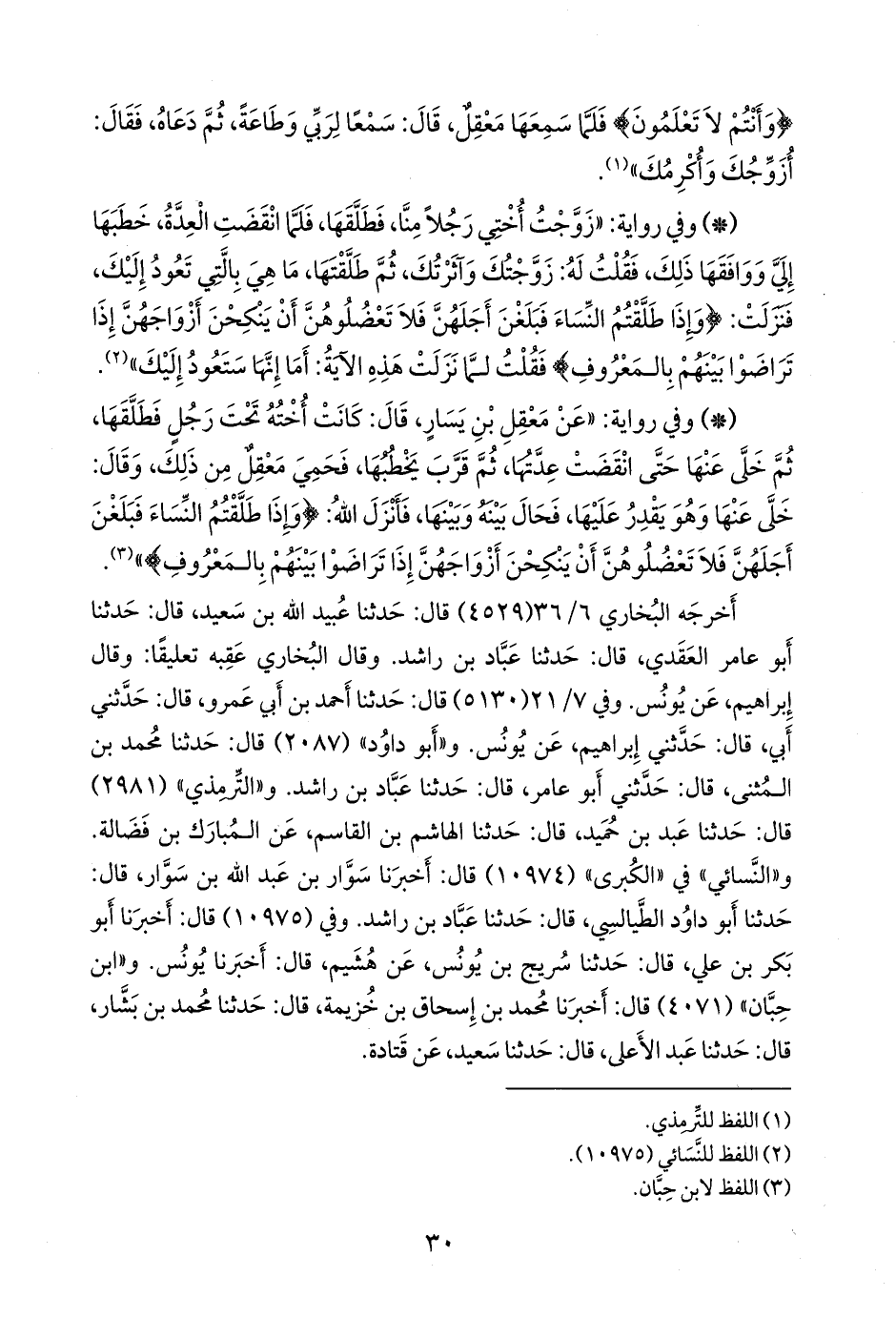 - وفي رواية: «عن معقل بن يسار، قال: كانت أخته تحت رجل فطلقها، ثم خلى عنها حتى انقضت عدتها، ثم قرب يخطبها، فحمي معقل من ذلك، وقال: خلى عنها وهو يقدر عليها، فحال بينه وبينها، فأنزل الله: {وإذا طلقتم النساء فبلغن أجلهن فلا تعضلوهن أن ينكحن أزواجهن إذا تراضوا بينهم بالمعروف}» (¬٢).