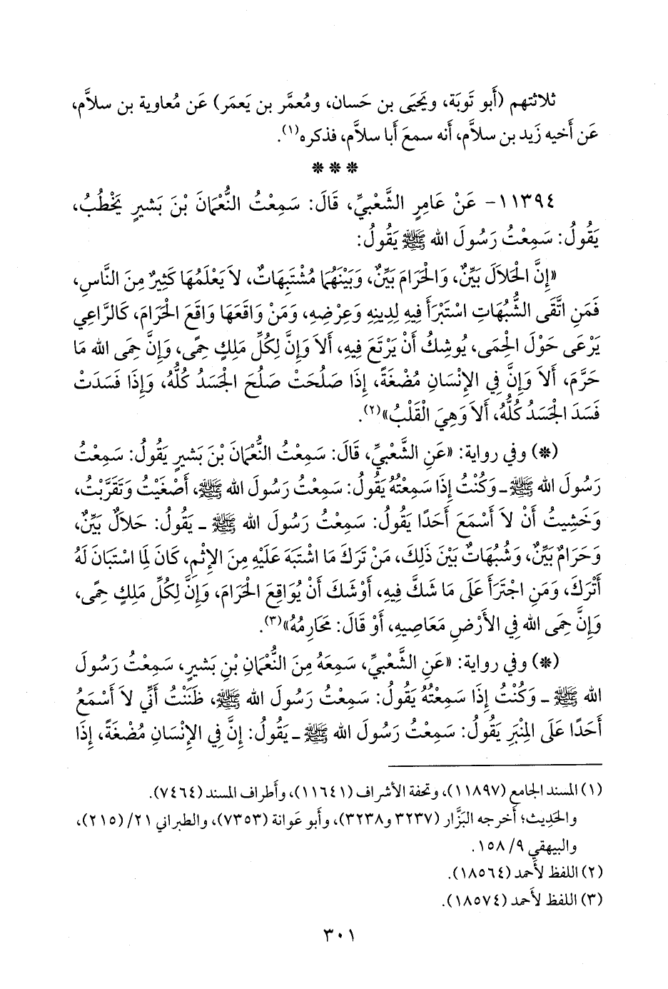 ١١٣٩٤ - عن عامر الشعبي، قال: سمعت النعمان بن بشير يخطب، يقول: سمعت رسول الله صَلى الله عَليه وسَلم يقول: