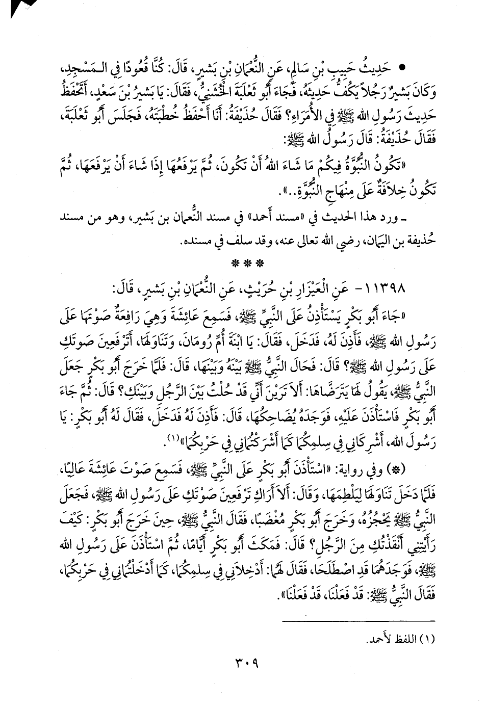- ورد هذا الحديث في «مسند أحمد» في مسند النعمان بن بشير، وهو من مسند حذيفة بن اليمان، رضي الله تعالى عنه، وقد سلف في مسنده.