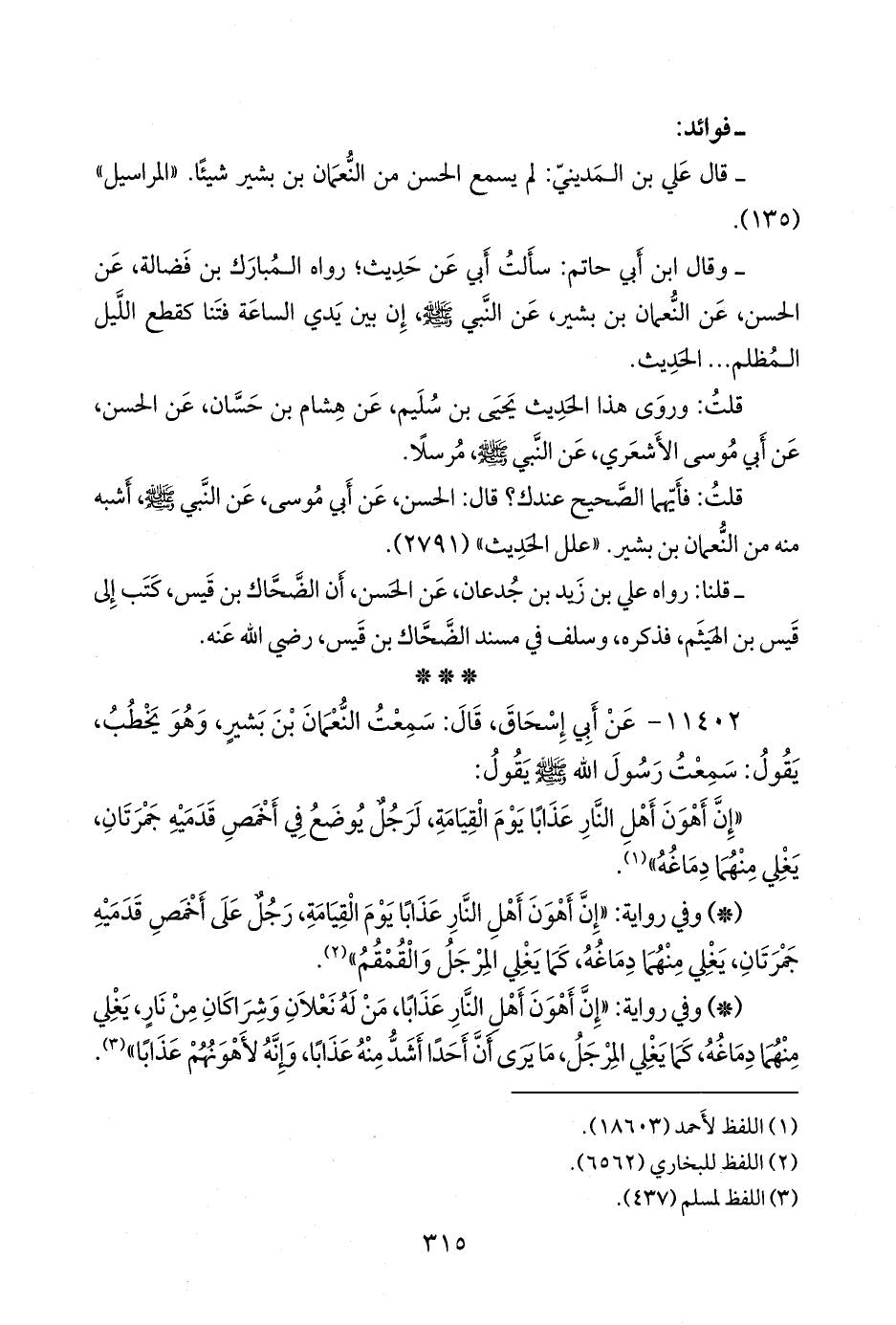 - وفي رواية: «إن أهون أهل النار عذابا، من له نعلان وشراكان من نار، يغلي منهما دماغه، كما يغلي المرجل، ما يرى أن أحدا أشد منه عذابا، وإنه لأهونهم عذابا» (¬٣).