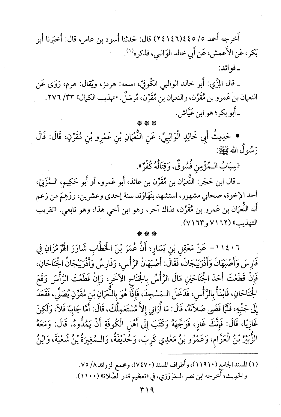 - قال ابن حجر: النعمان بن مقرن بن عائذ، أَبو عَمرو، أو أَبو حكيم، المزني، أحد الإخوة، صحابي مشهور، استشهد بنهاوند سنة إحدى وعشرين، ووهم من زعم أنه النعمان بن عَمرو بن مقرن، فذاك آخر، وهو ابن أخي هذا، وهو تابعي. «تقريب التهذيب» (٧١٦٢ و ٧١٦٣).