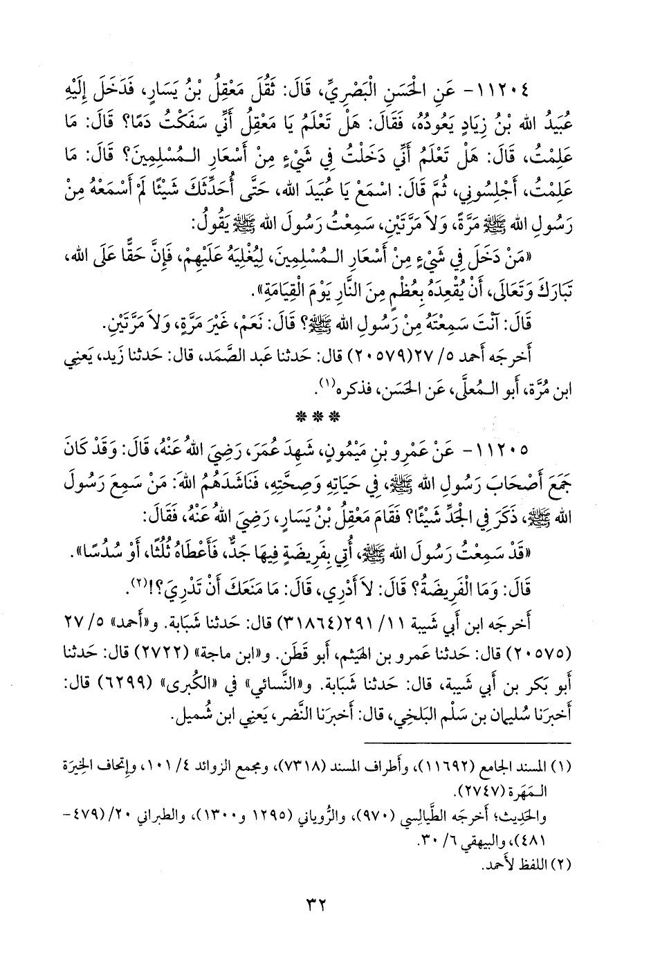 ١١٢٠٥ - عن عَمرو بن ميمون، شهد عمر، رضي الله عنه، قال: وقد كان جمع أصحاب رسول الله صَلى الله عَليه وسَلم في حياته وصحته، فناشدهم الله: من سمع رسول الله صَلى الله عَليه وسَلم ذكر في الجد شيئا؟ فقام معقل بن يسار، رضي الله عنه، فقال: