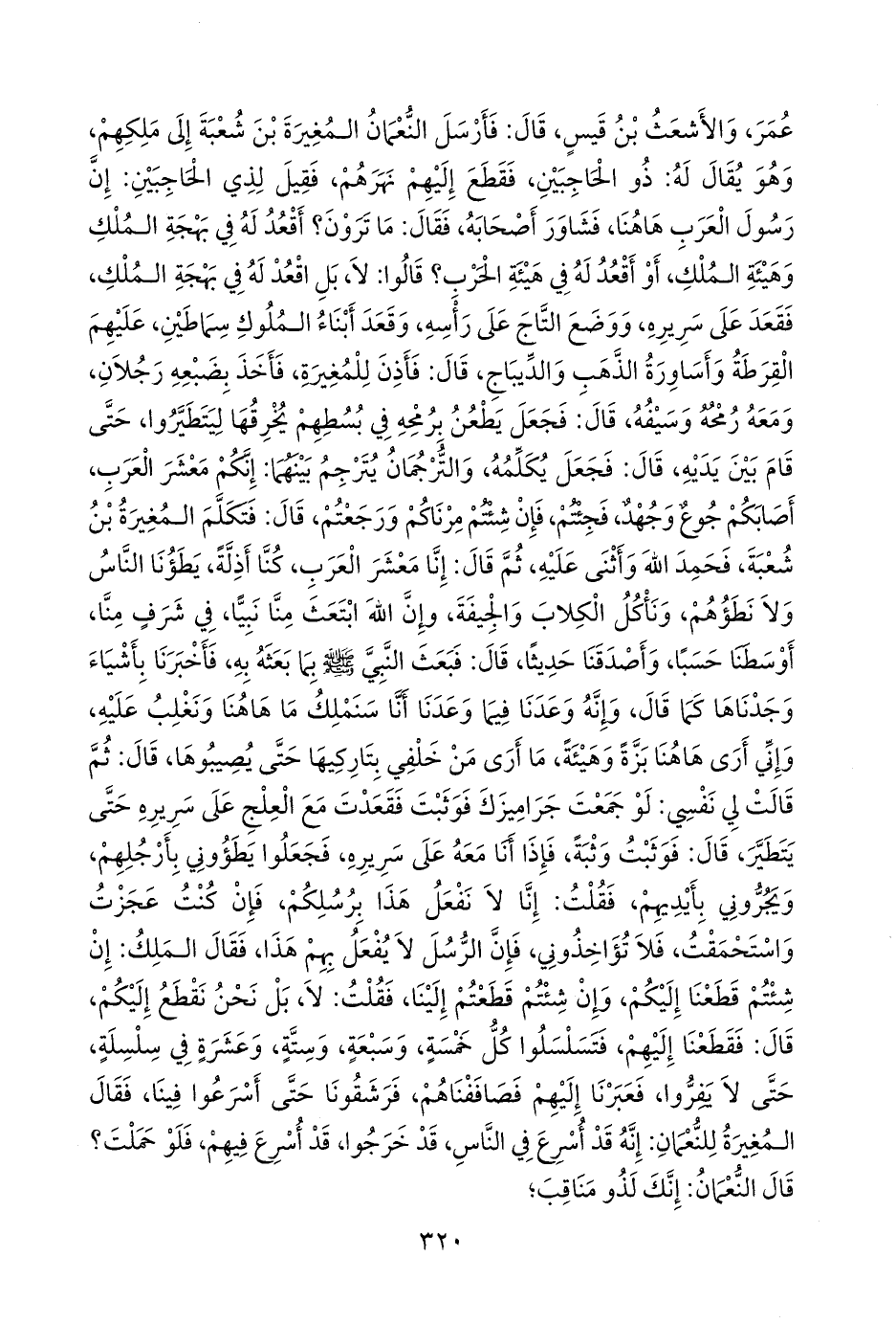 قال: فبعث النبي صَلى الله عَليه وسَلم بما بعثه به، فأخبرنا بأشياء وجدناها كما قال، وإنه وعدنا فيما وعدنا أنا سنملك ما هاهنا ونغلب عليه، وإني أرى هاهنا بزة وهيئة، ما أرى من خلفي بتاركيها حتى يصيبوها، قال: ثم قالت لي نفسي: لو جمعت جراميزك فوثبت فقعدت مع العلج على سريره حتى يتطير، قال: فوثبت وثبة، فإذا أنا معه على سريره، فجعلوا يطؤوني بأرجلهم، ويجروني بأيديهم، فقلت: إنا لا نفعل هذا برسلكم، فإن كنت عجزت واستحمقت، فلا تؤاخذوني، فإن الرسل لا يفعل بهم هذا، فقال الملك: إن شئتم قطعنا إليكم، وإن شئتم قطعتم إلينا، فقلت: لا، بل نحن نقطع إليكم، قال: فقطعنا إليهم، فتسلسلوا كل خمسة، وسبعة، وستة، وعشرة في سلسلة، حتى لا يفروا، فعبرنا إليهم فصاففناهم، فرشقونا حتى أسرعوا فينا، فقال المغيرة للنعمان: إنه قد أسرع في الناس، قد خرجوا، قد أسرع فيهم، فلو حملت؟ قال النعمان: إنك لذو مناقب؛
