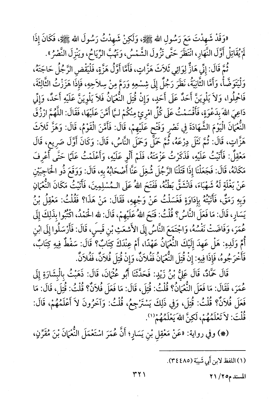 قال حماد، قال علي بن زيد: فحدثنا أبو عثمان، قال: ذهبت بالبشارة إلى عمر، فقال: ما فعل النعمان؟ قلت: قتل، قال: ما فعل فلان؟ قلت: قتل، قال: ما فعل فلان؟ قلت: قتل، وفي ذلك يسترجع، قلت: وآخرون لا أعلمهم، قال: قلت: لا تعلمهم، لكن الله يعلمهم (¬١).