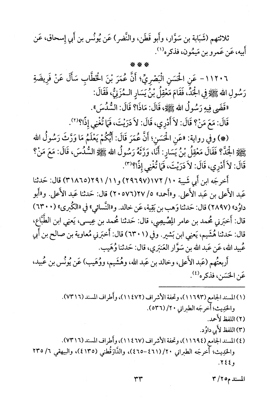 ١١٢٠٦ - عن الحسن البصري؛ أن عمر بن الخطاب سأل عن فريضة رسول الله صَلى الله عَليه وسَلم في الجد، فقام معقل بن يسار المزني، فقال: