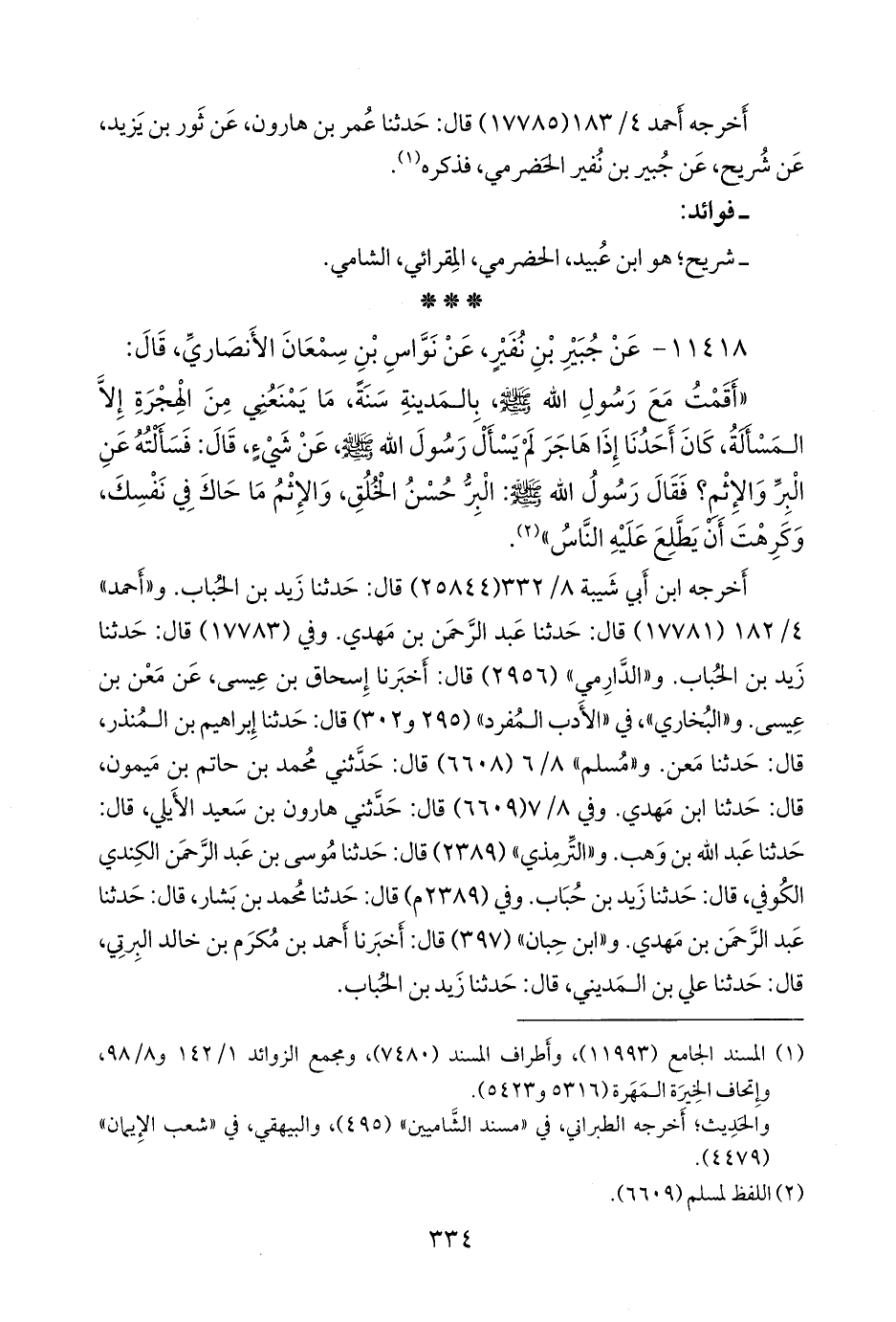أربعتهم (زيد، وعبد الرَّحمَن بن مهدي، ومعن، وعبد الله بن وهب) عن معاوية بن صالح الحضرمي، عن عبد الرَّحمَن بن جُبير بن نُفير الحضرمي، عن أبيه، فذكره (¬٢).