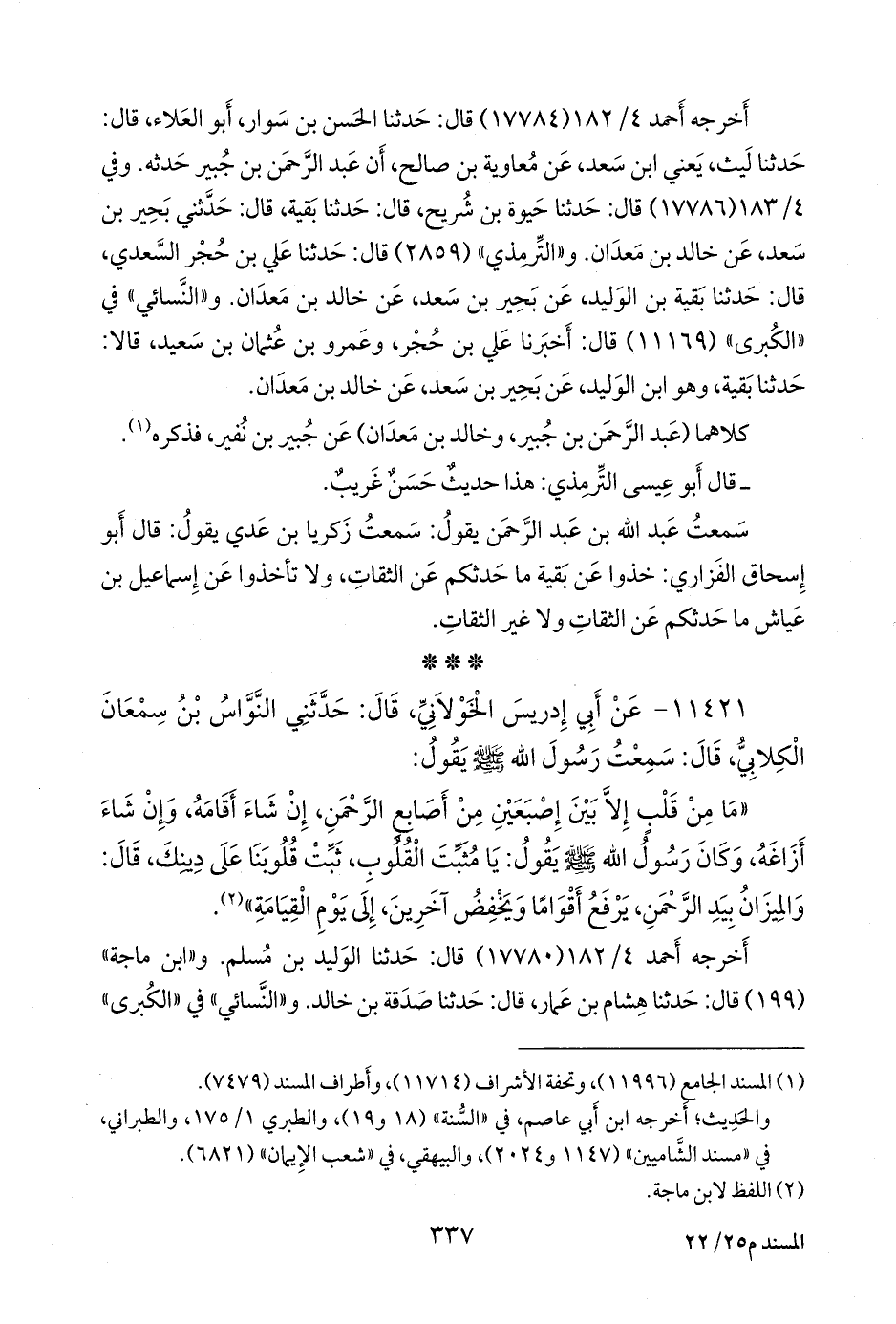 أخرجه أحمد (١٧٧٨٤) قال: حدثنا الحسن بن سوار، أَبو العلاء، قال: حدثنا ليث، يعني ابن سعد، عن معاوية بن صالح، أن عبد الرَّحمَن بن جبير حدثه. وفي ٤/ ١٨٣ (١٧٧٨٦) قال: حدثنا حَيْوَة بن شُرَيح، قال: حدثنا بقية، قال: حدثني بَحِير بن سعد، عن خالد بن مَعدان. و «التِّرمِذي» (٢٨٥٩) قال: حدثنا علي بن حُجْر السعدي، قال: حدثنا بَقيَّة بن الوليد، عن بَحِير بن سعد، عن خالد بن مَعدان. و «النَّسَائي» في «الكبرى» (١١١٦٩) قال: أخبرنا علي بن حُجْر، وعَمرو بن عثمان بن سعيد، قالا: حدثنا بقية، وهو ابن الوليد، عن بَحِير بن سعد، عن خالد بن مَعدان.