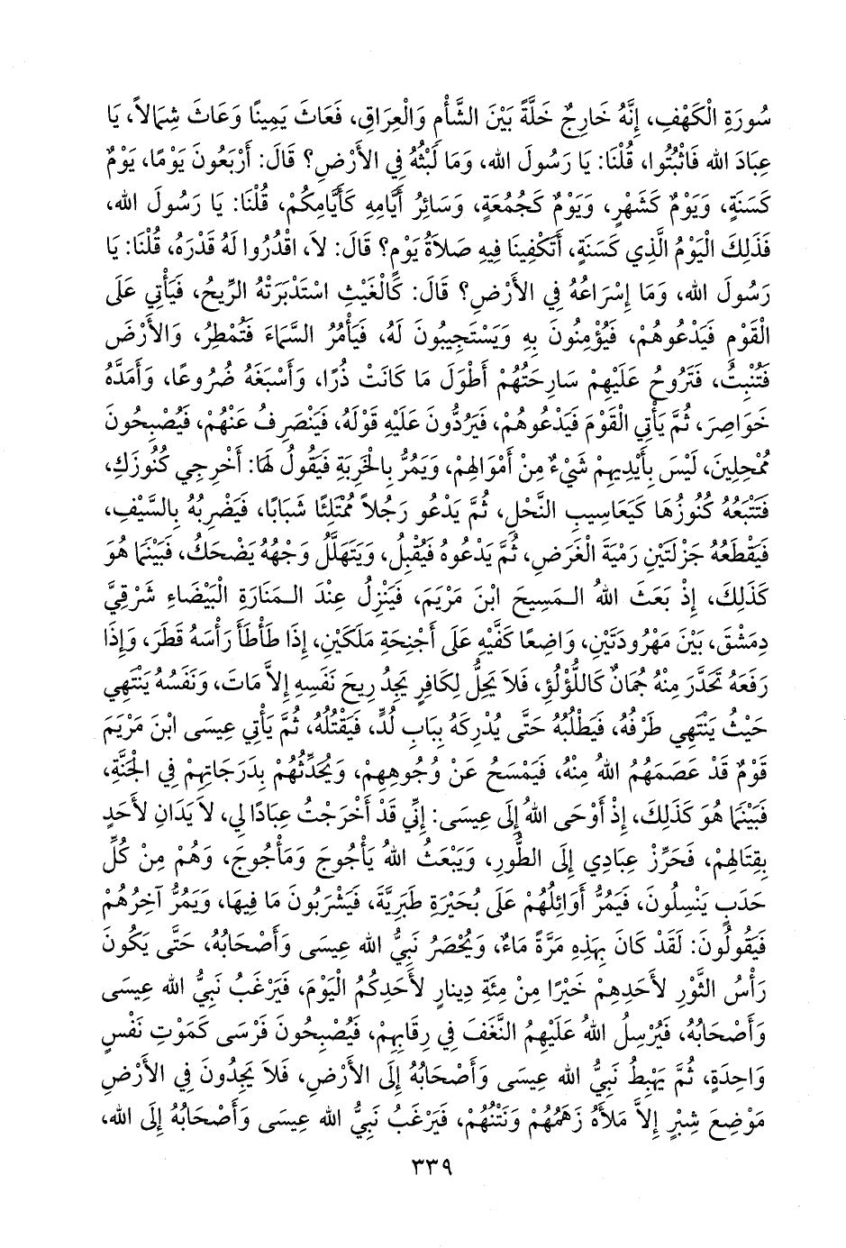 فينزل عند المنارة البيضاء شرقي دمشق، بين مهرودتين، واضعا كفيه على أجنحة ملكين، إذا طأطأ رأسه قطر، وإذا رفعه تحدر منه جمان كاللؤلؤ، فلا يحل لكافر يجد ريح نفسه إلا مات، ونفسه ينتهي حيث ينتهي طرفه، فيطلبه حتى يدركه بباب لد، فيقتله، ثم يأتي عيسى ابن مريم قوم قد عصمهم الله منه، فيمسح عن وجوههم، ويحدثهم بدرجاتهم في الجنة، فبينما هو كذلك، إذ أوحى الله إلى عيسى: إني قد أخرجت عبادا لي، لا يدان لأحد بقتالهم، فحرز عبادي إلى الطور، ويبعث الله يأجوج ومأجوج، وهم من كل حدب ينسلون، فيمر أوائلهم على بحيرة طبرية، فيشربون ما فيها، ويمر آخرهم فيقولون: لقد كان بهذه مرة ماء، ويحصر نبي الله عيسى وأصحابه، حتى يكون رأس الثور لأحدهم خيرًا من مئة دينار لأحدكم اليوم، فيرغب نبي الله عيسى وأصحابه، فيرسل الله عليهم النغف في رقابهم، فيصبحون فرسى كموت نفس واحدة، ثم يهبط نبي الله عيسى وأصحابه إلى الأرض، فلا يجدون في الأرض موضع شبر إلا ملأه زهمهم ونتنهم، فيرغب نبي الله عيسى وأصحابه إلى الله،