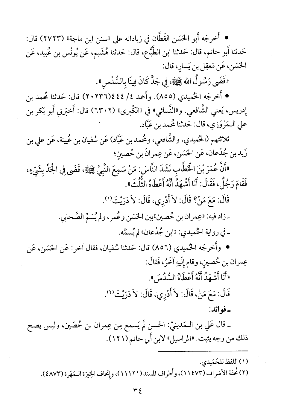 - وقال أَبو حاتم الرازي: لم يسمع الحسن من عمران بن حصين، وليس يصح من وجه يثبت. «المراسيل» لابن أبي حاتم (١٢٢).