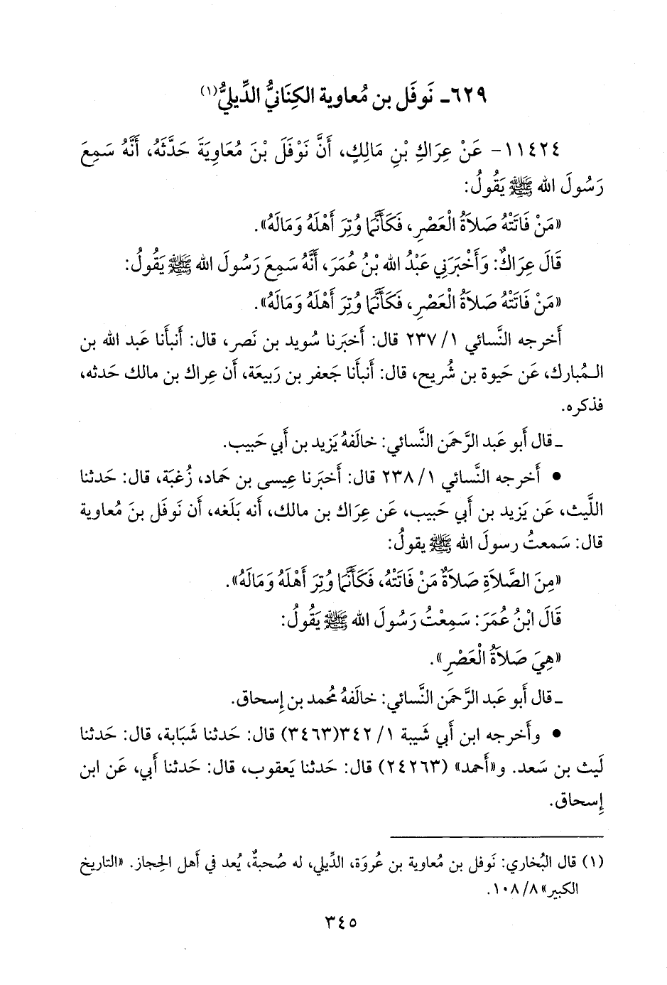 • أَخرجه النَّسَائي ١/ ٢٣٨ قال: أخبرنا عيسى بن حماد، زغبة، قال: حدثنا الليث، عن يزيد بن أبي حبيب، عن عراك بن مالك، أنه بلغه، أن نوفل بن معاوية قال: سمعت رسول الله صَلى الله عَليه وسَلم يقول: