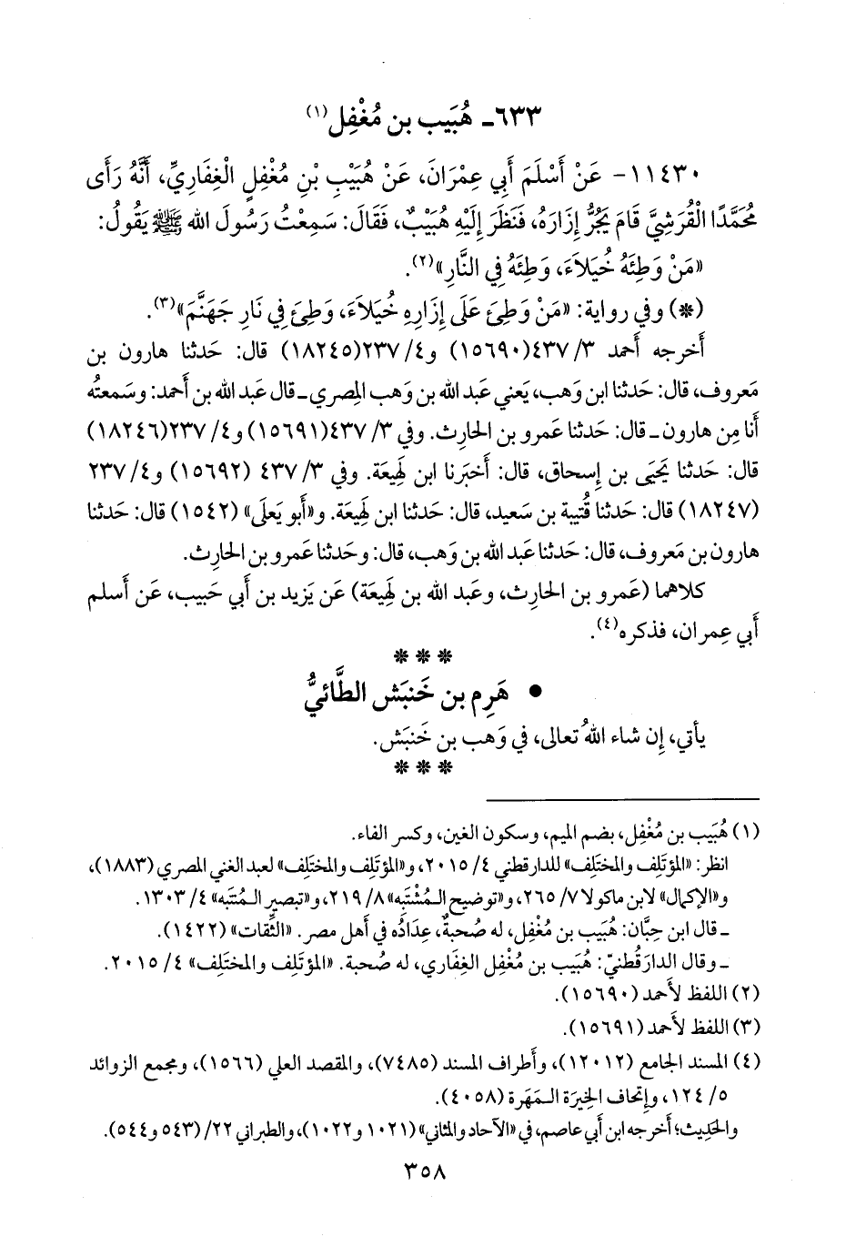 (¬١) هبيب بن مُغْفِل، بضم الميم، وسكون الغين، وكسر الفاء، انظر: «المُؤْتَلِف والمُختَلِف» للدارقطني ٤/ ٢٠١٥، و «المُؤْتَلِف والمُختَلِف» لعبد الغني الأزدي المصري (١٨٨٣)، و «الإكمال» لابن ماكولا ٧/ ٢٦٥، و «توضيح المُشْتَبِه» ٨/ ٢١٩، و «تبصير المنتبه» ٤/ ١٣٠٣، قال ابن حبان: هبيب بن مُغْفِل، له صحبة، عداده في أهل مصر. «الثقات» (١٤٢٢)، وقال الدارقُطني: هبيب بن مُغْفِل الغِفاري، له صحبة. «المُؤْتَلِف والمُختَلِف» ٤/ ٢٠١٥.