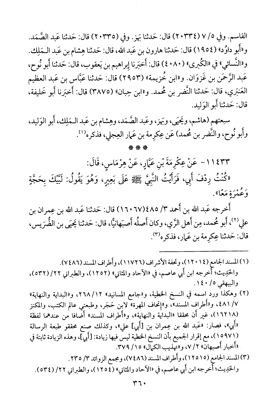 أخرجه عبد الله بن أحمد (١٦٠٦٧) قال: حدثنا عبد الله بن عمران بن علي (¬١)، أَبو محمد، من أهل الري، وكان أصله أصبهانيا، قال: حدثنا يحيى بن الضريس، قال: حدثنا عكرمة بن عمار، فذكره (¬٢).