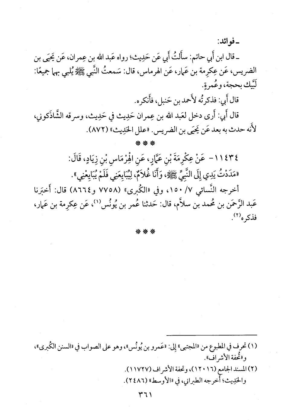 - قلنا: إسناده ضعيفٌ؛ قال ابن أَبي حاتم: سأَلتُ أَبي عن حديثٍ؛ رواه عبد الله بن عمران، عن يَحيى بن الضُّرَيس، عن عكرمة بن عمار، عن الهرْماس، قال: سمعتُ النبي صَلى الله عَليه وسَلم يلبي بهما جميعًا: لبَّيك بِحَجَّة وعمرَة.