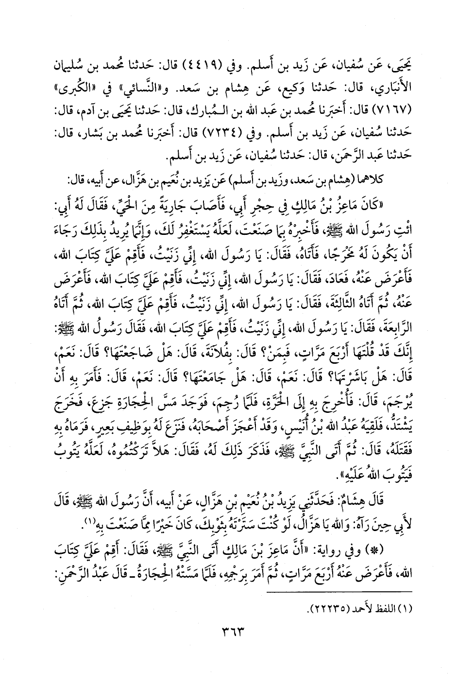 - وفي رواية: «أن ماعز بن مالك أتى النبي صَلى الله عَليه وسَلم فقال: أقم علي كتاب الله، فأعرض عنه أربع مرات، ثم أمر برجمه، فلما مسته الحجارة ـ قال عبد الرَّحمَن: