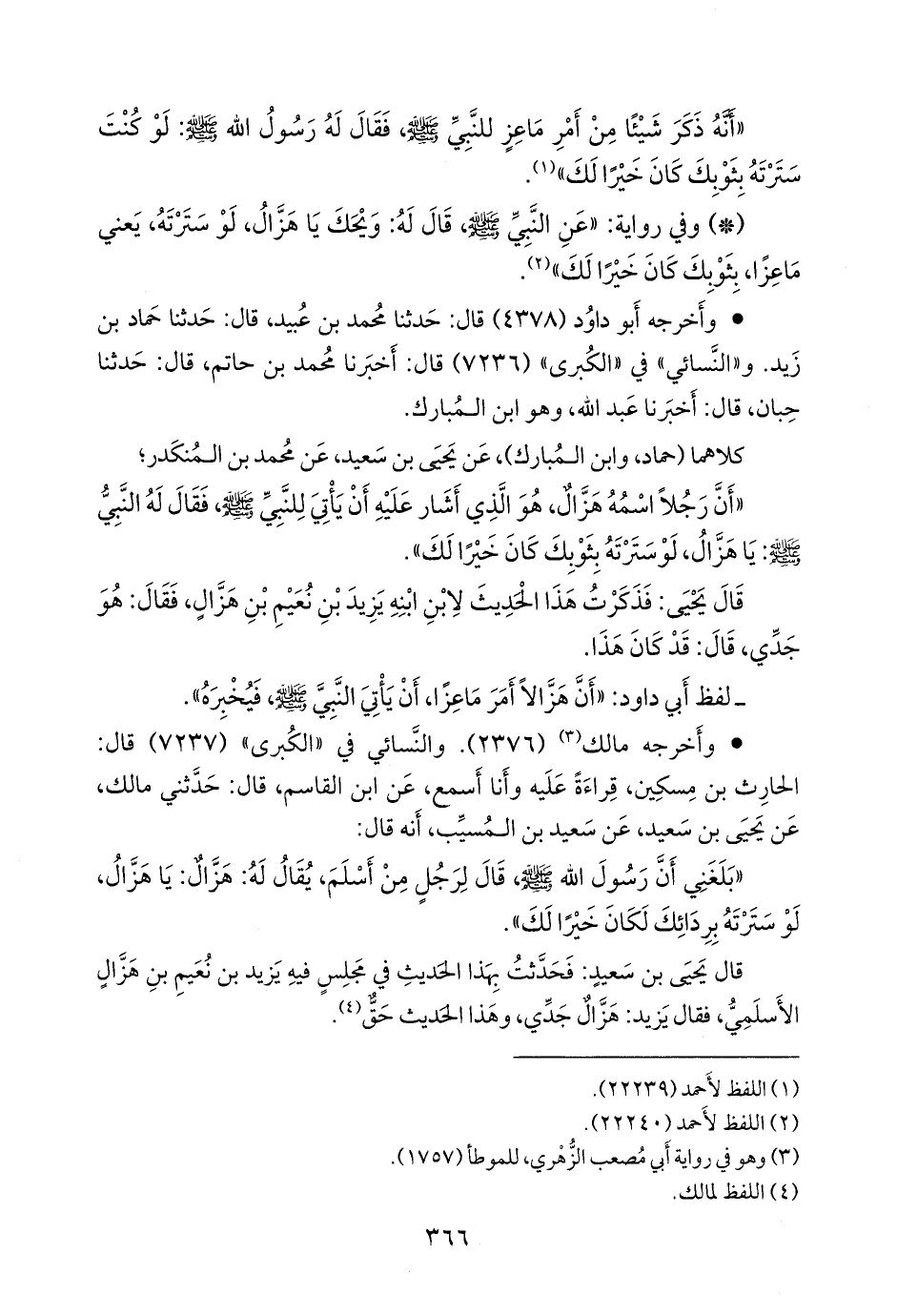 قال يحيى بن سعيد: فحدثت بهذا الحديث في مجلس فيه يزيد بن نعيم بن هزال الأسلمي، فقال يزيد: هزال جدي، وهذا الحديث حق (¬١).