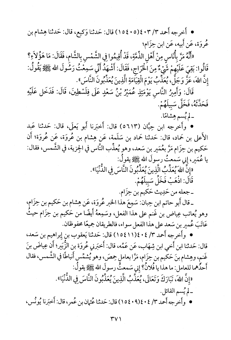 • وأخرجه ابن حبان (٥٦١٣) قال: أخبرنا أَبو يَعلى، قال: حدثنا عبد الأعلى بن حماد، قال: حدثنا حماد بن سلمة، عن هشام بن عروة، عن عروة؛ أن حكيم بن حزام مر بعمير بن سعد، وهو يعذب الناس في الجزية، في الشمس، فقال: يا عمير، إني سمعت رسول الله صَلى الله عَليه وسَلم يقول: