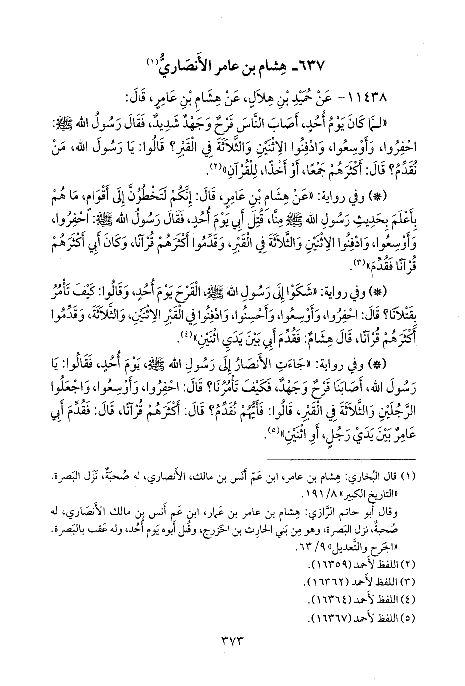 - وفي رواية: «عن هشام بن عامر، قال: إنكم لتخطون إلى أقوام، ما هم بأعلم بحديث رسول الله صَلى الله عَليه وسَلم منا، قتل أبي يوم أحد، فقال رسول الله صَلى الله عَليه وسَلم: احفروا، وأوسعوا، وادفنوا الاثنين والثلاثة في القبر، وقدموا أكثرهم قرآنا، وكان أبي أكثرهم قرآنا فقدم» (¬٣).