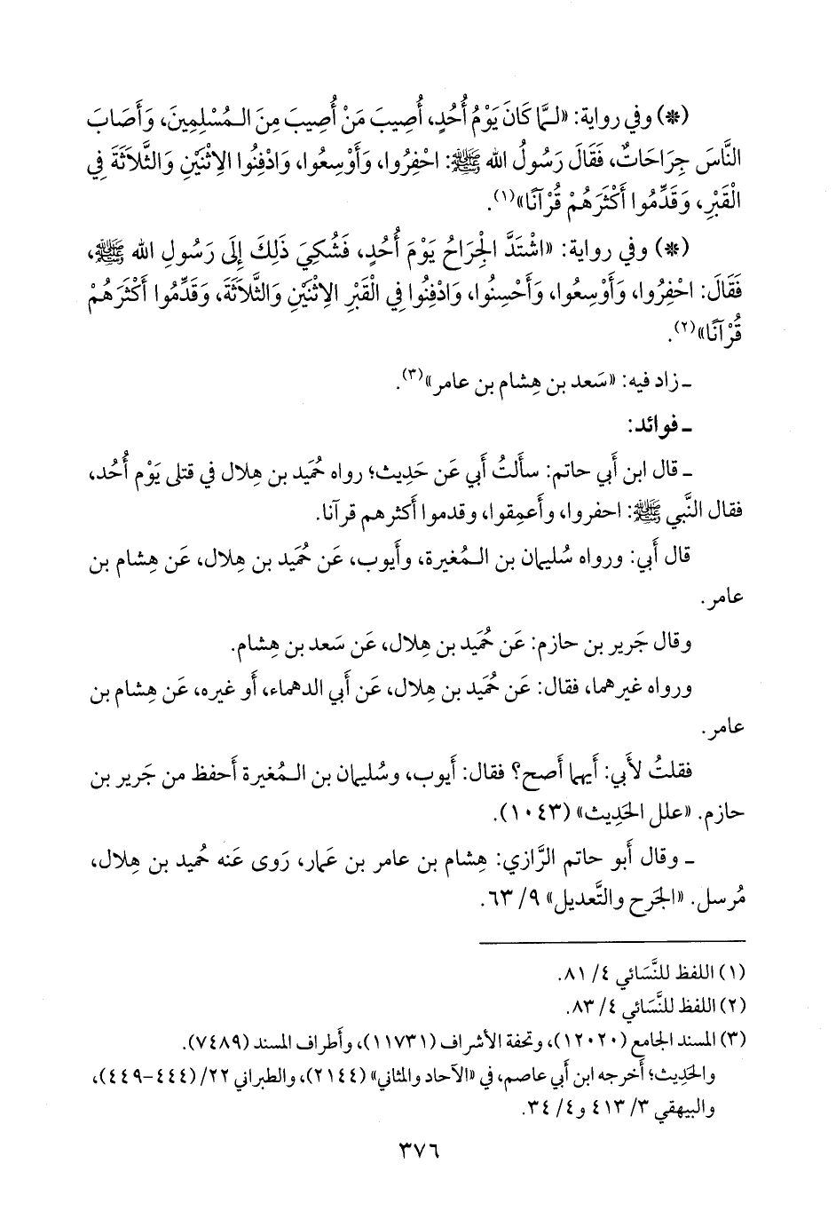 - قال عبد الرَّحمَن بن أبي حاتم الرازي: سألتُ أبي عن حديثٍ؛ رواه حميد بن هلال في قتلى يوم أحد، فقال النبي صَلى الله عَليه وسَلم: احفروا، وأعمقوا، وقدموا أكثرهم قرآنا.