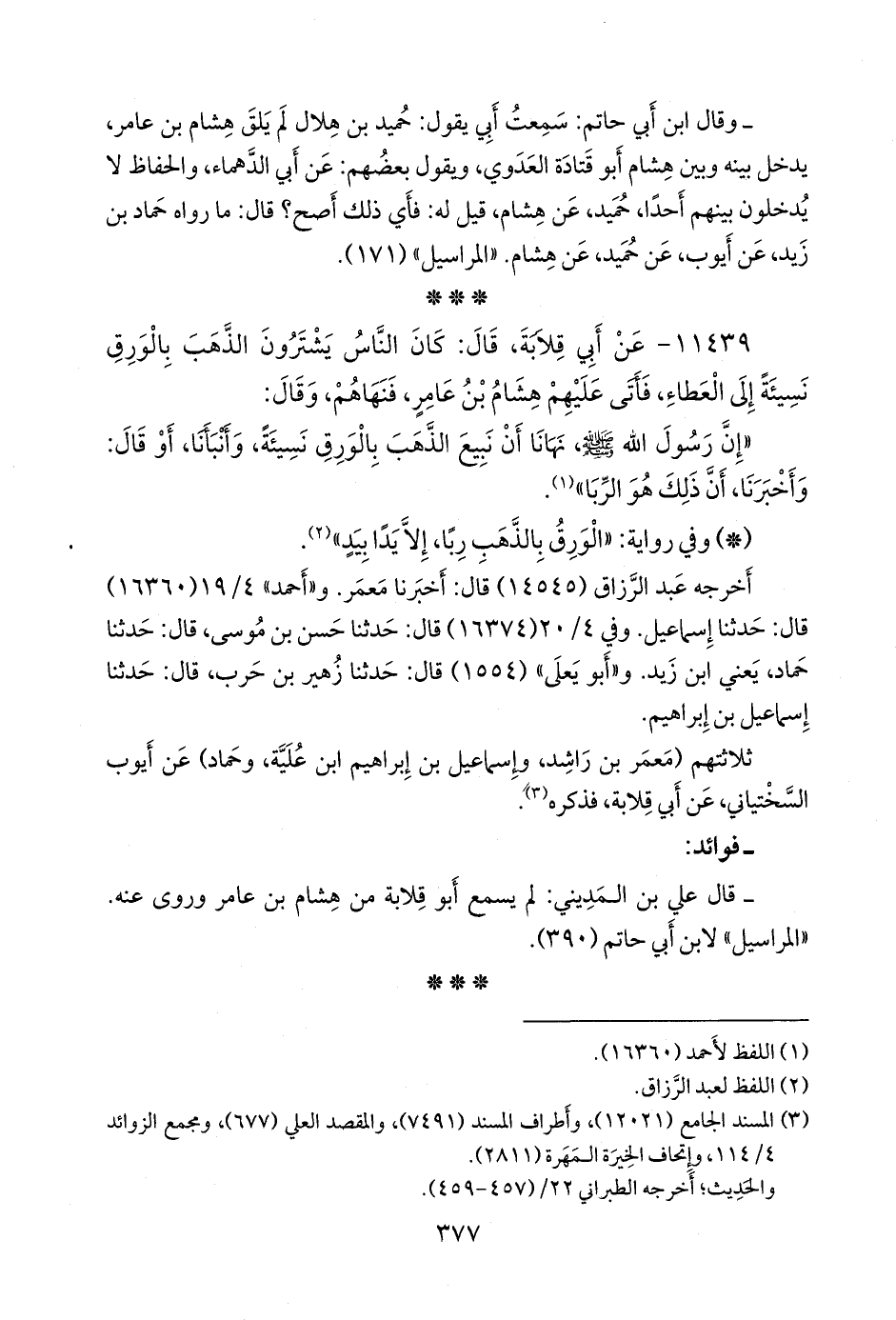 ١١٤٣٩ - عن أبي قلابة، قال: كان الناس يشترون الذهب بالورق نسيئة إلى العطاء، فأتى عليهم هشام بن عامر، فنهاهم، وقال: