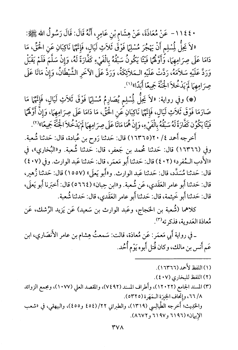 ١١٤٤٠ - عن معاذة، عن هشام بن عامر، أنه قال: قال رسول الله صَلى الله عَليه وسَلم: