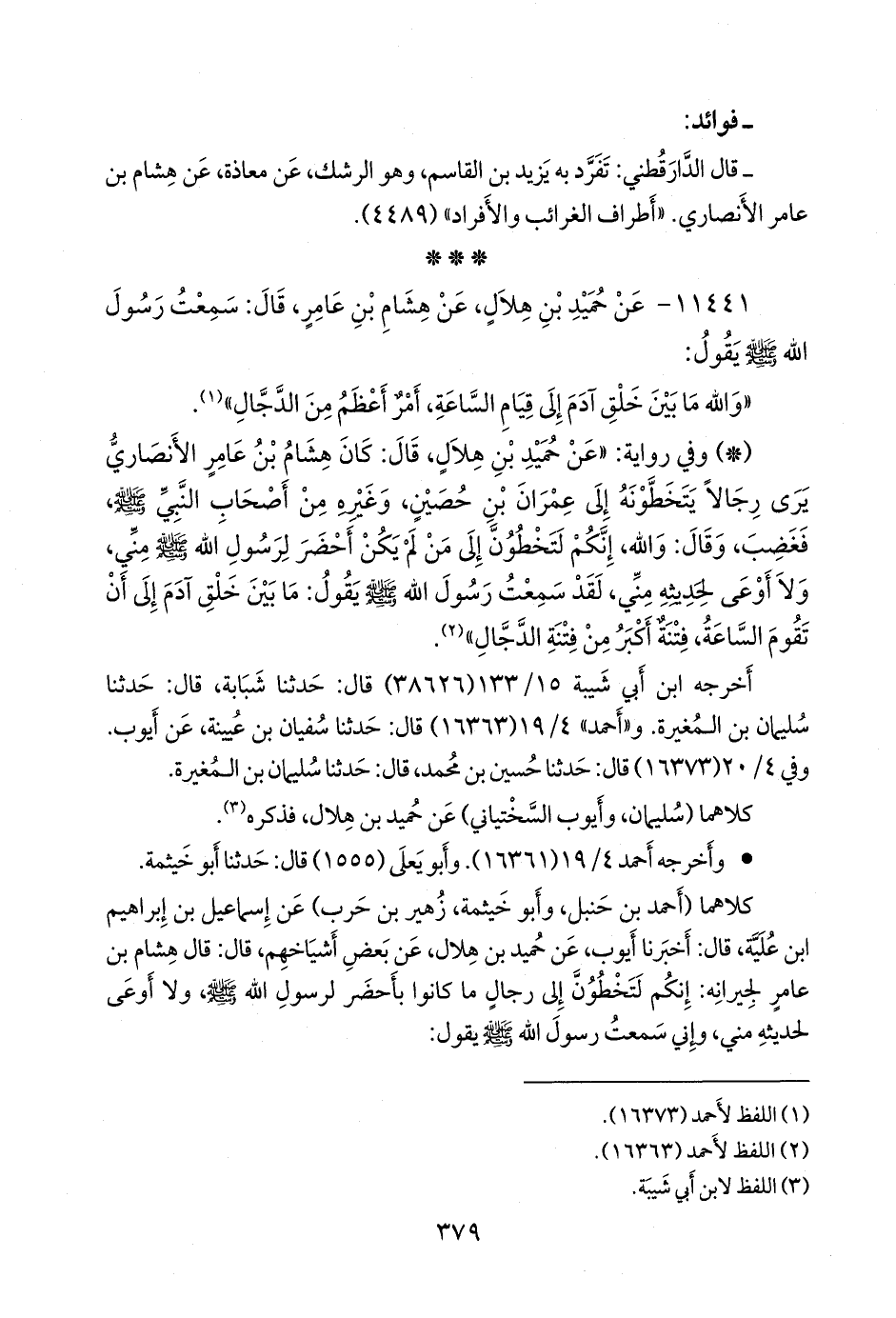 كلاهما (أحمد بن حنبل، وأَبو خيثمة زهير بن حرب) عن إسماعيل بن إبراهيم ابن عُلَية، قال: أخبرنا أيوب، عن حميد بن هلال، عن بعض أشياخهم، قال: قال هشام بن عامر لجيرانه: إنكم لتخطون إلى رجال ما كانوا بأحضر لرسول الله صَلى الله عَليه وسَلم ولا أوعى لحديثه مني، وإني سمعت رسول الله صَلى الله عَليه وسَلم يقول: