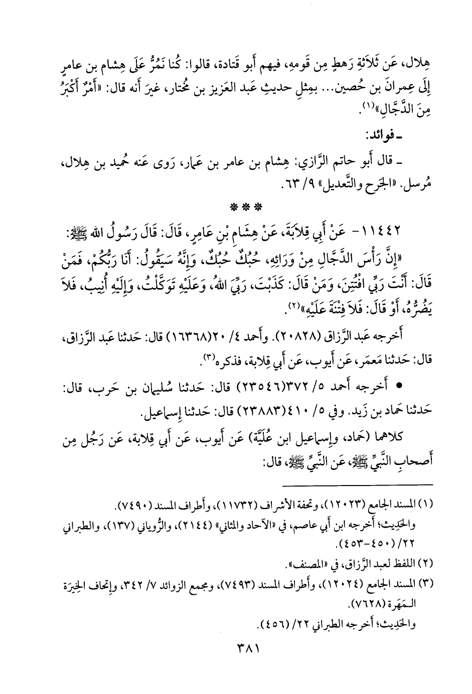 كلاهما (حماد، وإسماعيل ابن عُلَية) عن أيوب، عن أبي قلابة، عن رجل من أصحاب النبي صَلى الله عَليه وسَلم عن النبي صَلى الله عَليه وسَلم قال: