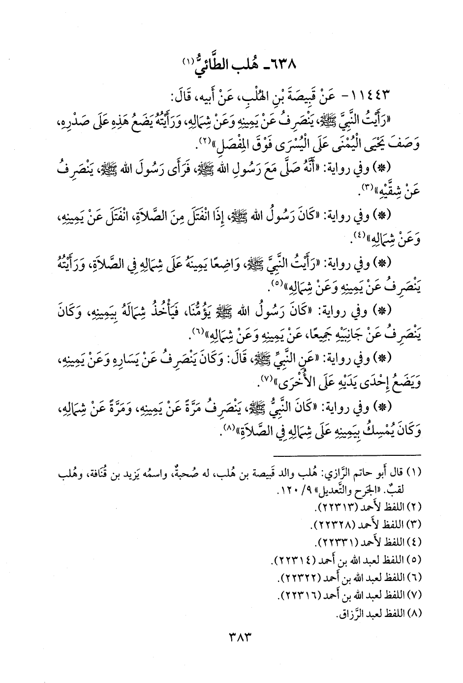 - وفي رواية: «رأيت النبي صَلى الله عَليه وسَلم واضعا يمينه على شماله في الصلاة، ورأيته ينصرف عن يمينه وعن شماله» (¬٥).