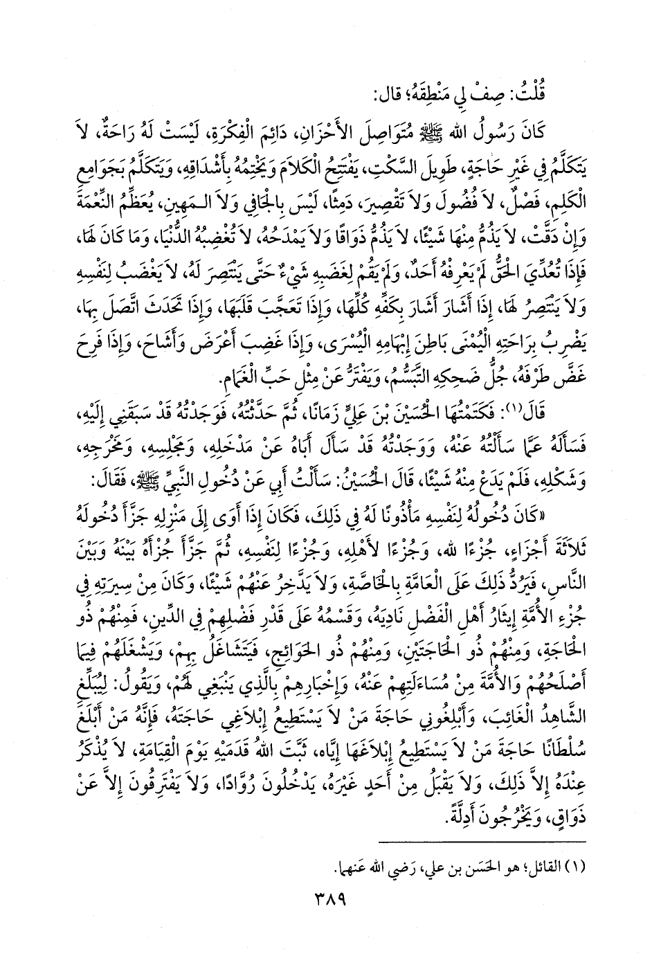 ـ لفظ ٣٣٦: «عَنِ الْحَسَنِ بْنِ عَلِيٍّ، قَالَ: سَأَلْتُ خَالِي هِنْدَ بْنَ أَبِي هَالَةَ، وَكَانَ وَصَّافًا، عَنْ حِلْيَةِ النَّبِيِّ صَلى الله عَليه وسَلم، وَأَنَا أَشْتَهِي أَنْ يَصِفَ لِي مِنْهَا شَيْئًا، فَقَالَ: كَانَ رَسُولُ اللهِ صَلى الله عَليه وسَلم فَخْمًا مُفَخَّمًا، يَتَلَأْلَأُ وَجْهُهُ تَلَأْلُؤَ الْقَمَرِ لَيْلَةَ الْبَدْرِ، فَذَكَرَ الْحَدِيثَ بِطُولِهِ، قَالَ الْحَسَنُ: فَكَتَّمْتُهَا الْحُسَيْنَ زَمَانًا، ثُمَّ حَدَّثْتُهُ فَوَجَدْتُهُ قَدْ سَبَقَنِي إِلَيْهِ، فَسَأَلَهُ عَمَّا سَأَلْتُهُ عَنْهُ، وَوَجَدْتُهُ قَدْ سَأَلَ أَبَاهَ عَنْ مَدْخَلِهِ وَعَنْ مَخْرَجِهِ وَشَكْلِهِ فَلَمْ يَدَعْ مِنْهُ شَيْئًا» (¬١).