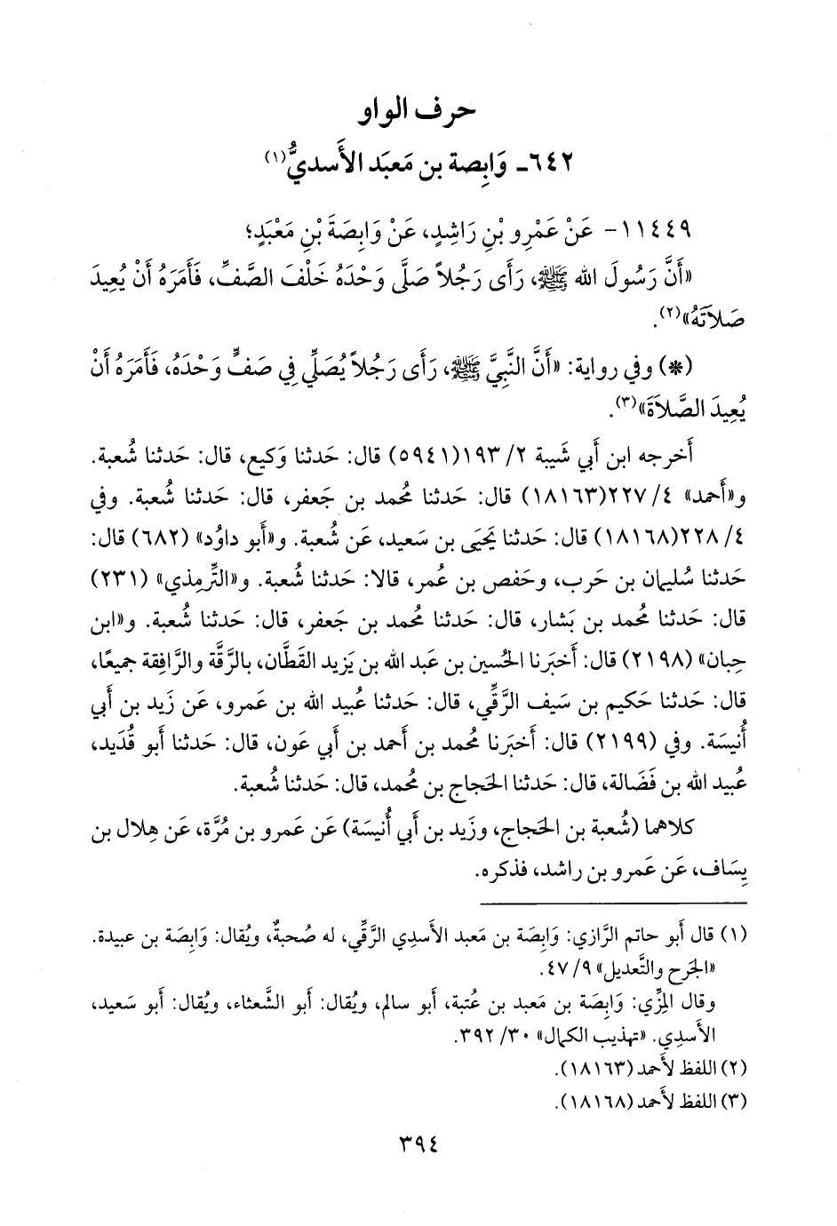 - وفي رواية: «عن هلال بن يَسَاف، عن زياد بن أبي الجعد، قال: أقامني على وابصة بن مَعبد، فقال: حدثني هذا، أنه صلى خلف الصف وحده، فأمره النبي صَلى الله عَليه وسَلم أن يعيد صلاته» (¬٢).