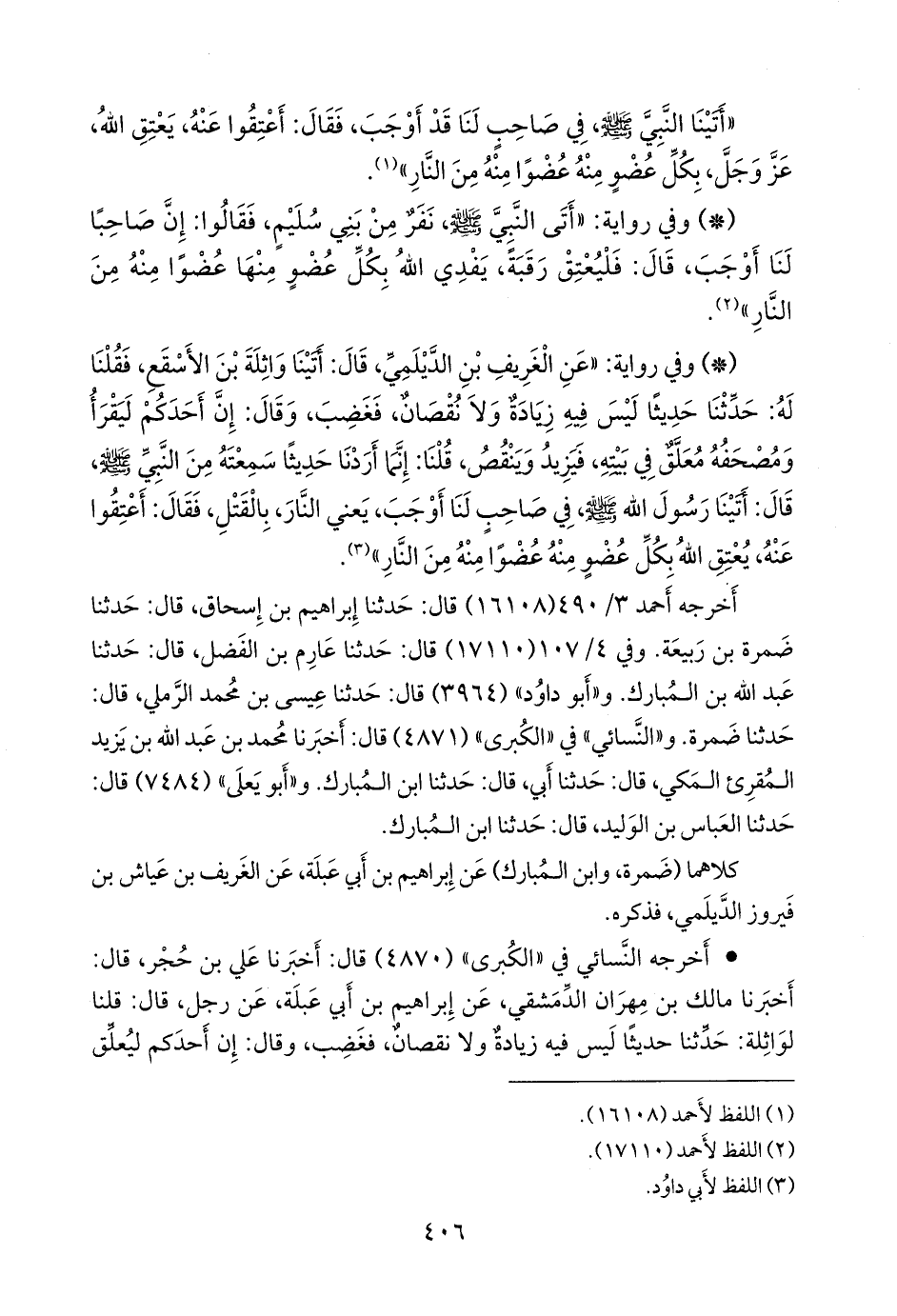 «كنا مع رسول الله صَلى الله عَليه وسَلم في غزوة تبوك، فأقبل نفر من بني سليم، فقالوا: يا رسول الله، إن صاحبنا قد أوجب، قال: فليعتق رقبة، فإن بكل عضو عضوا من النار».