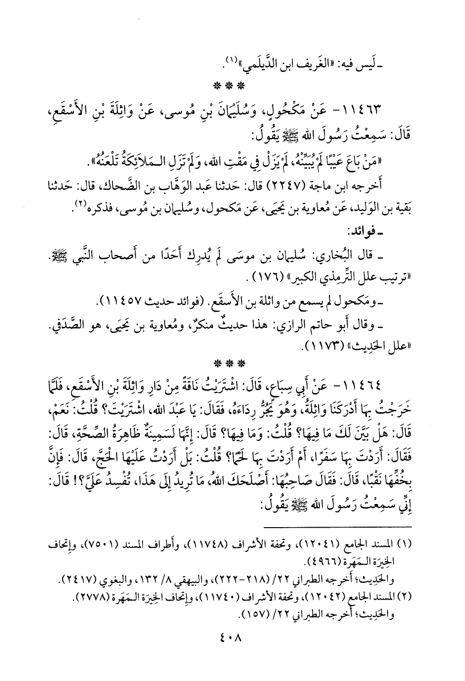 ١١٤٦٤ - عن أبي سباع، قال: اشتريت ناقة من دار واثلة بن الأسقع، فلما خرجت بها أدركنا واثلة، وهو يجر رداءه، فقال: يا عبد الله، اشتريت؟ قلت: نعم، قال: هل بين لك ما فيها؟ قلت: وما فيها؟ قال: إنها لسمينة ظاهرة الصحة، قال: فقال: أردت بها سفرا، أم أردت بها لحما؟ قلت: بل أردت عليها الحج، قال: فإن بخفها نقبا، قال: فقال صاحبها: أصلحك الله، ما تريد إلى هذا، تفسد علي؟! قال: إني سمعت رسول الله صَلى الله عَليه وسَلم يقول: