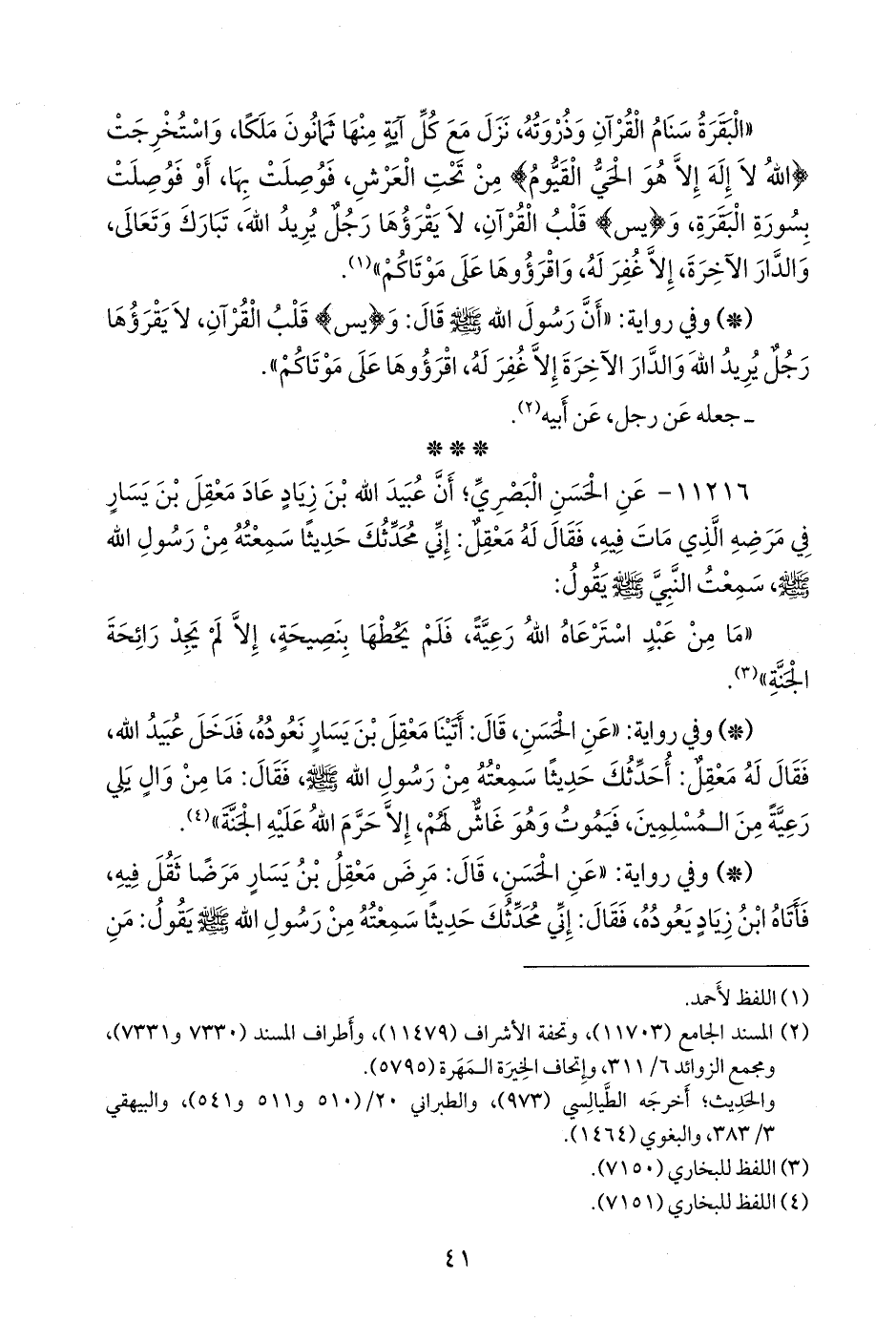 ١١٢١٦ - عن الحسن البصري؛ أن عُبيد الله بن زياد عاد معقل بن يسار في مرضه الذي مات فيه، فقال له معقل: إني محدثك حديثا سمعته من رسول الله صَلى الله عَليه وسَلم سمعت النبي صَلى الله عَليه وسَلم يقول: