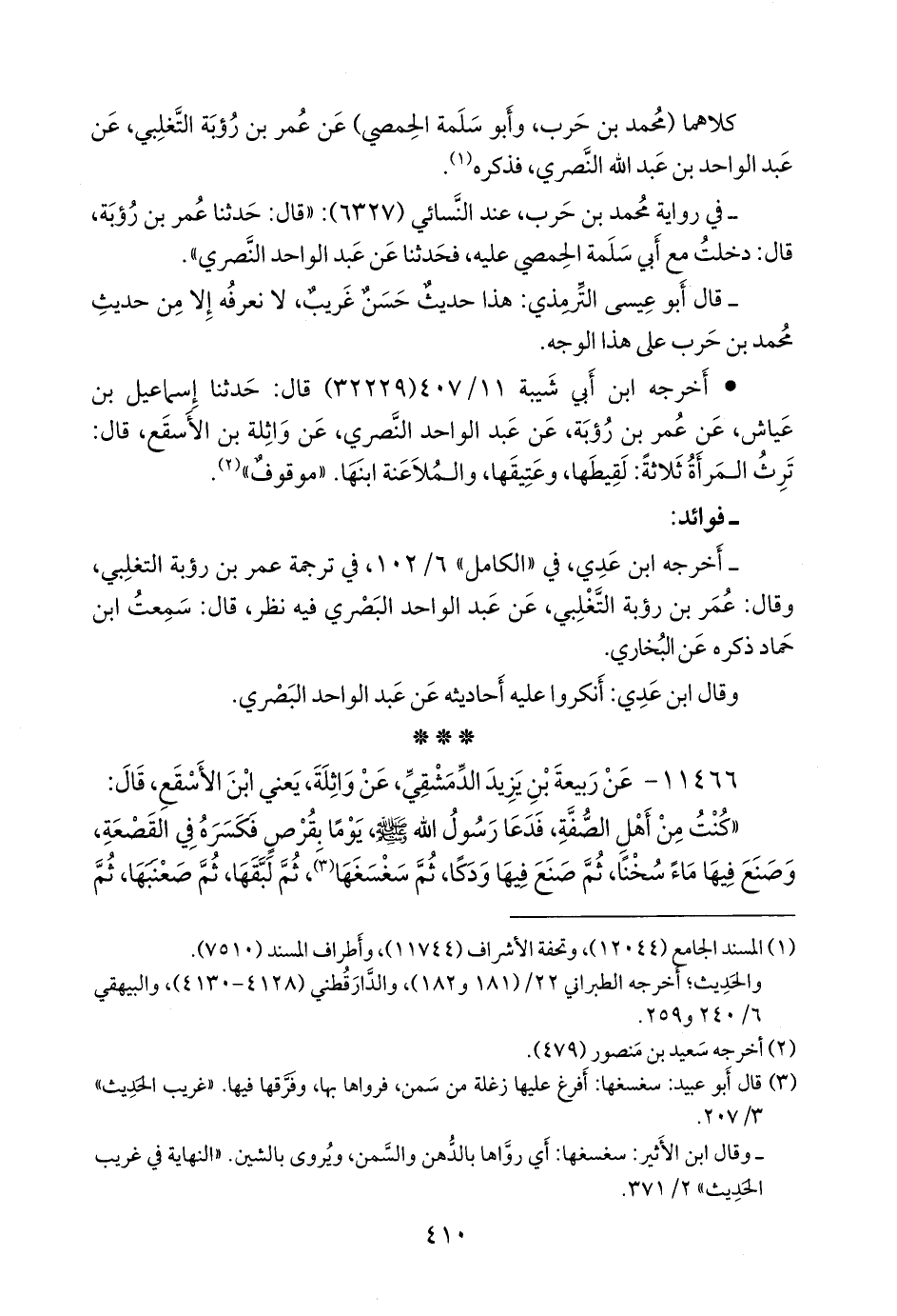 - قلنا: إسناده ضعيفٌ؛ أَخرجه ابن عَدي في «الكامل» ٧/ ٣٩٨ في مناكير عمر بن رُؤْبة التَّغلِبي، وقال: عمر بن رُؤْبة التَّغلِبي، عن عبد الواحد النَّصري، فيه نَظر، وسمعتُ ابن حماد ذكره عن البخاري.